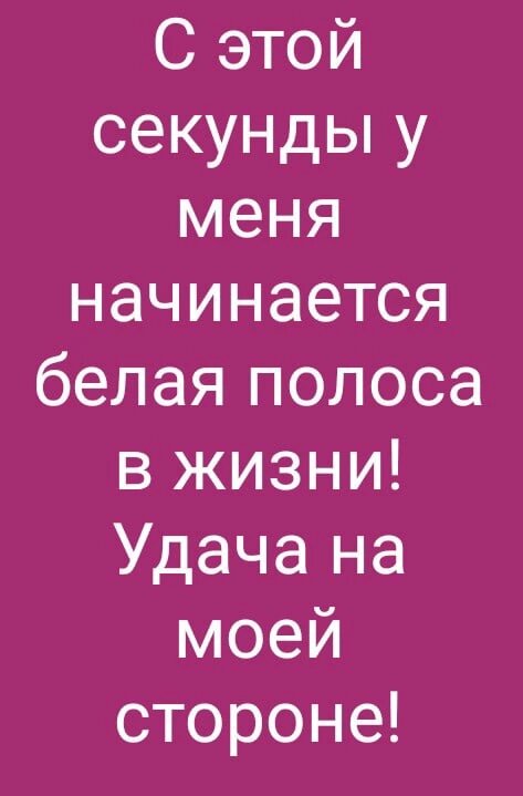 Начинаем Повторять эти слова ,, С этой секунды у меня начинается белая полоса в жизни! Удача на моей стороне!" Надо говорить утром и вечером,не менее чем 21 день,а лучше постоянно ,как вспоминается. Результат будет 100% . Главное проговаривать и поставить 👍 👇🏼. 🔯