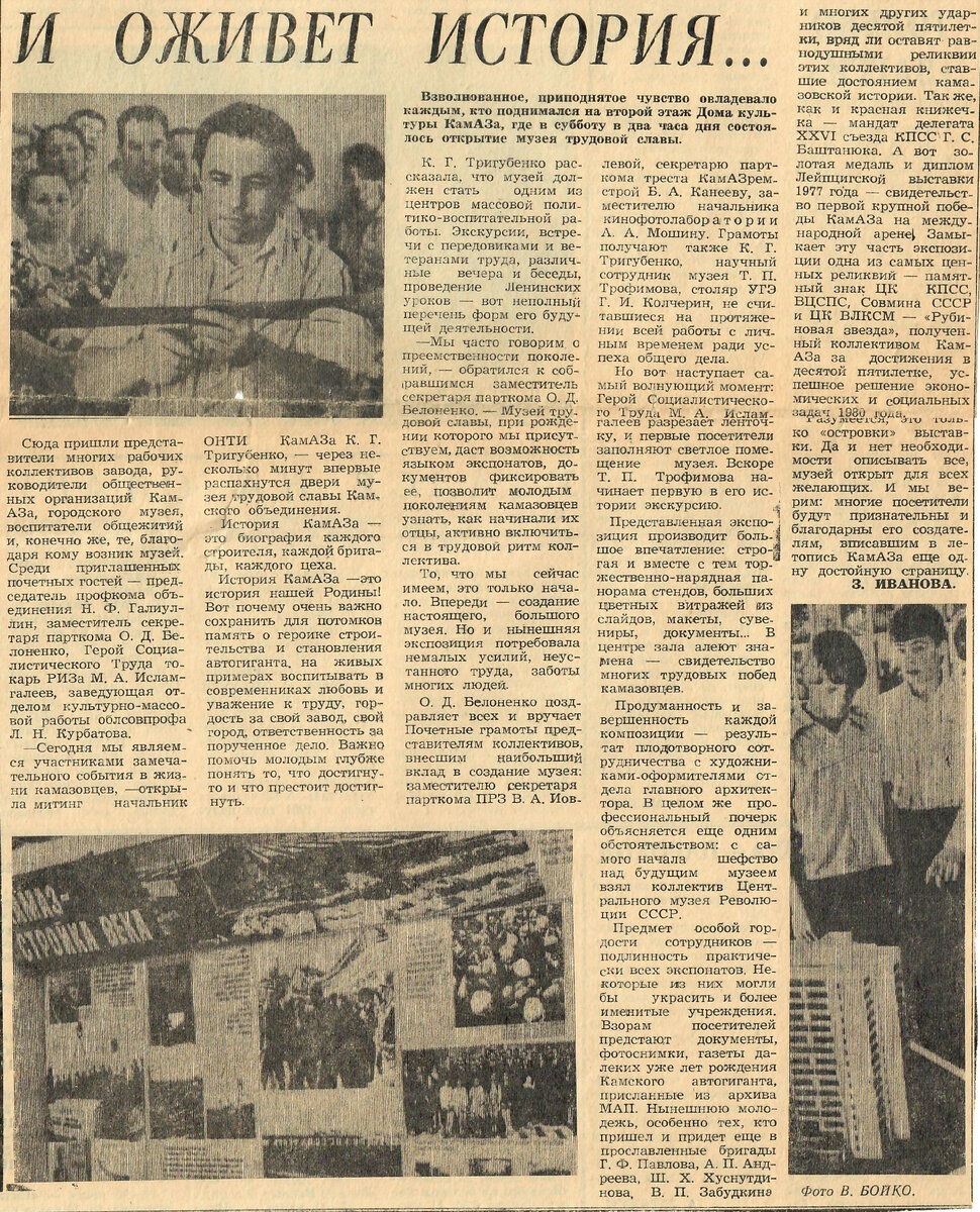 Музей был открыт 18 июля 1981 года. Вот как об этом писала газета «Рабочий КАМАЗа» от 22 июля 1981 года.