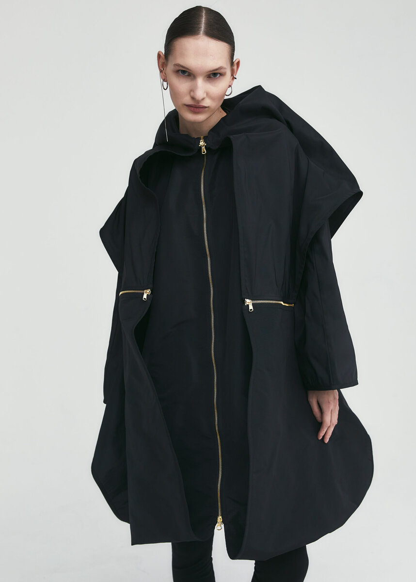Этот прием был взят дизайнером в основу изделия-трансформера, который из длинного плаща можно превратить в oversize-куртку с помощью застежек-молний. Цвет фурнитуры проводит ассоциацию с церковным и сусальным золотом. На видео можно посмотреть варианты стилизаций плаща: Также история облачения нашла отражение и в высоком воротнике плаща. Дело в том, что в греческой православной традиции верх фелони плоский, а фелони русских священников отличаются твердым опл