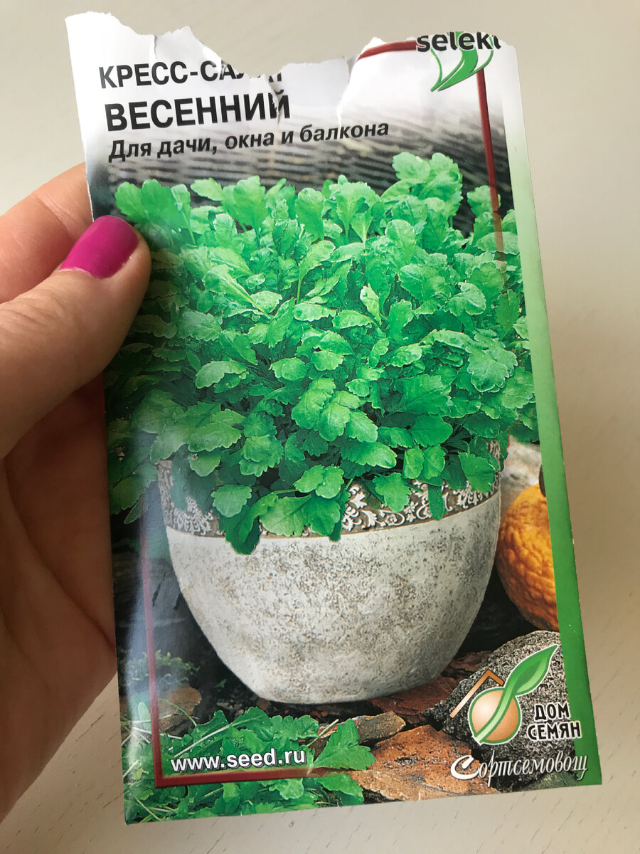 В последнее время я сильно увлеклась цветоводством и выращиванием зелени. Но так как дачного участка у меня нет, приходится делать это дома на подоконнике или на балконе, благо десять метров балконного пространства это позволяют. Но чаще всего обычную зелень я выращиваю просто в горшке на подоконнике. Расскажу про свою последнюю «посадку», а именно кресс-салат весенний. В магазине я выбрала пакетик с семенами, который мне понравился по своему внешнему виду, плюс картинка на упаковке обещает густой раскидистый куст кресс-салата в обычном цветочном горшке Семена этой зелени я посадила в середине апреля Причём особо не старалась, взяла первую попавшуюся землю для рассады, небольшой горшок и просто засыпала семена в эту землю Первые проростки появились у меня буквально через пару дней И с тех пор они росли очень быстро Каждый день я наблюдала их рост, но срезать пока не хотела, хотя на вкус конечно же попробовала Кресс-салат оказался очень насыщенным, пряным, в общем вкус его меня абсо