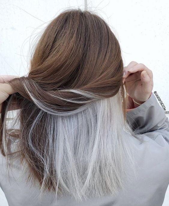 Скрытое окрашивание - техника окрашивания, в которой волосы ,окрашенные в яркий цвет на затылочной зоне, лежат под основной массой волос. Если у вас на работе/учёбе определенный дресс-код, то это окрашивание для вас. Такое окрашивание подойдёт любой девушке. Но, прежде чем краситься, лучше всего обсудить детали с парикмахером. Перед окрашиванием, необходимо затылочную зону осветлить, чтобы цвет был равномерным и красивым. Для девушек с темными волосами лучше выбирать неоновые оттенки, а также можно приглушённые. У светленьких девушек выбора больше: яркие цвета, неоновые, пастельные, и т.д. Но вот девушкам с рыжими волосами, лучше всего, придти к мастеру. На сегодняшний день, для скрытого окрашивания берут такие оттенки как: синий, фиолетовый,красный, розовый, зелёный. А также выполняют радужное окрашивание, или голографическое. Помимо этого всего в скрытом окрашивании делают пепельные оттенки и все оттенки блонда. Данное окрашивание выполняется не быстро. После чего каждые 2-3 недел