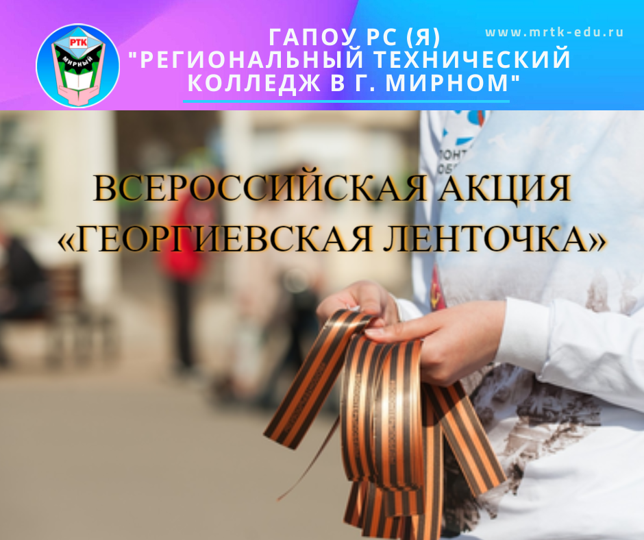 Добровольцы МРТК - участники Всероссийской акции по раздаче георгиевских лент «Ближе к сердцу». Добровольцы нашего Мирнинского регионального технического колледжа присоединились к Всероссийской акции «Георгиевская ленточка». С 5 по 9 мая волонтеры раздадут георгиевские ленточки в колледже и на улицах г. Мирного. Главной целью акции «Георгиевская лента» является стремление во что бы то ни стало не дать забыть новым поколениям, кто и какой ценой одержал победу в самой страшной войне прошлого века, чьими наследниками мы остаёмся, кем должны гордиться, о ком помнить. Акция проходит под лозунгом: «Я помню! Я горжусь!». Георгиевская ленточка - символ не сломленного духом народа, который боролся, победил фашизм в Великой Отечественной войне. Этот символ уважения к ветеранам, дань памяти павшим на поле боя, благодарность людям, отдавшим все для фронта. Всем тем, благодаря кому мы победили в 1945 году. Привязывая ленточку на одежду, люди, таким образом, отдают дань памяти подвигу наших предко