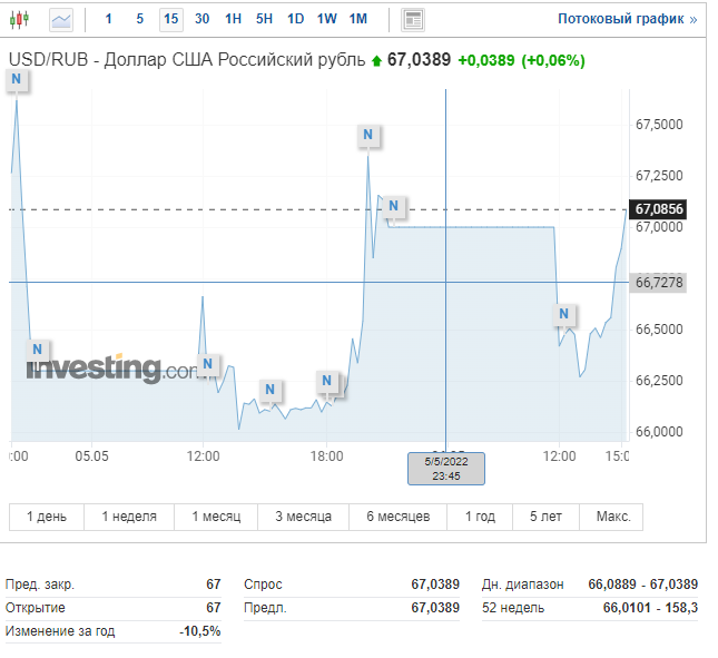 На открытии торгов 5 мая курс доллара на Мосбирже опустился ниже 66 рублей впервые с марта 2020 года. К 10:06 мск он упал на 1,49% — до 65,31 рубля. Курс евро в то же время снизился до 69,72 рубля впервые с 21 февраля 2020 года. На момент написания заметки доллар торгуется по 66,2 рубля, а евро — по 69,3 рубля. Курс рубля прежде определялся потоками капитала, но сейчас их движение практически остановилось из-за жёстких ограничений ЦБ и санкций, говорит главный экономист «Альфа-банка» Наталия Орлова. Нерезиденты больше не могут выводить средства, а западные страны не принимают «русские» деньги — валюта оказалась заперта в России, объясняет аналитик. Сейчас курс валют определяется торговыми потоками, соотношением экспорта и импорта. Поступления валюты от экспорта всё ещё остаются высокими — не меньше $40 млрд в месяц, по оценке Орловой. При этом экспортёры обязаны продавать 80% своей выручки. 29 апреля ЦБ предложил снизить эту цифру до 50%. В то же время импорт на фоне санкций упал почти