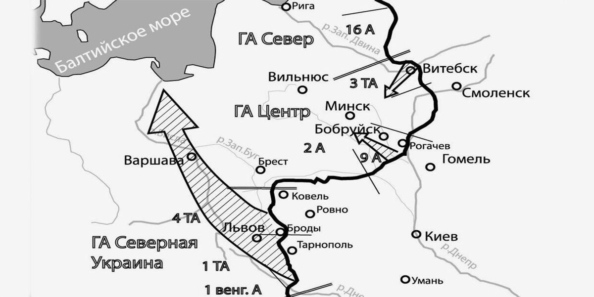 Говоря об операции "Багратион" стоило бы рассматривать ее в контексте так называемых "10 сталинских ударов". Сражения 1944 года развалили блок стран Оси, были выведены из строя союзницы Германии — Румыния, Болгария, Финляндия. В 1944 году почти вся территория СССР была освобождена от захватчиков, и военные действия были перенесены на территорию Германии и её союзников. Были разбиты и выведены из строя 136 дивизий противника, из них около 70 дивизий были окружены и уничтожены. Белорусская операция, считающаяся пятым из них, была одной из самых выдающихся в тактическом отношении. Подробнее расскажет сам Алексей Валерьевич: Но нельзя не отметить некоторые моменты, которые несколько теряются в рассказе. Во-первых, здесь РККА удалось реализовать концепцию глубокого прорыва. В предыдущих частях мы рассматривали окружение армии Паулюса под Сталинградом - так вот это не глубокий прорыв. На карте там можно было видеть масштабное отступление немцев с Кавказа и Кубани, но это не было результатом