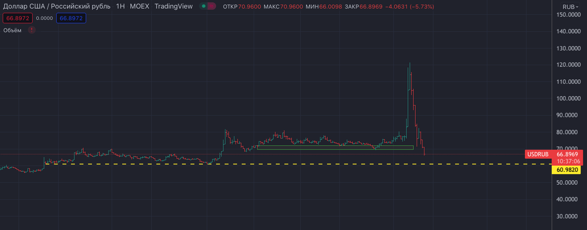 Доллар пробил сопротивление уровня 70 руб. и движется к 61 руб. за доллар На недельном графике с 2018 г. доллар пробил уровень сопротивления 70 руб. и движется к следующему уровню 61 руб. за доллар На сегодняшний момент цена за доллар очень привлекательна и доллар можно набирать лесенкой... Пока сам закупался по 66 руб. и писал данный пост, доллар уже 69 руб.- а это плюсом 4%
