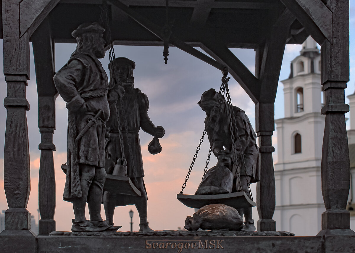Минск, Памятник Городской весы Это памятный знак тому, что Минск в 1499 году получил Магдебурское право. Вместе с Магдебурским правом городу присваивалась своя мера веса и длины. Решили за основу композиции взять именно весы. Раньше каждый гражданин мог обратиться в ратушу, если ему казалось, что его обвесили или обманули. На памятном знаке как раз запечатлен этот момент. Продавец взвешивает свой товар для купца, который с ним торгуется. А рядом стоит представитель ратуши, который внимательно наблюдает за процессом. #СвароговУсадьбы #СвароговСтроения #минск #minsk #belarus #беларусь #путешествие #архитектура #памятник #travel