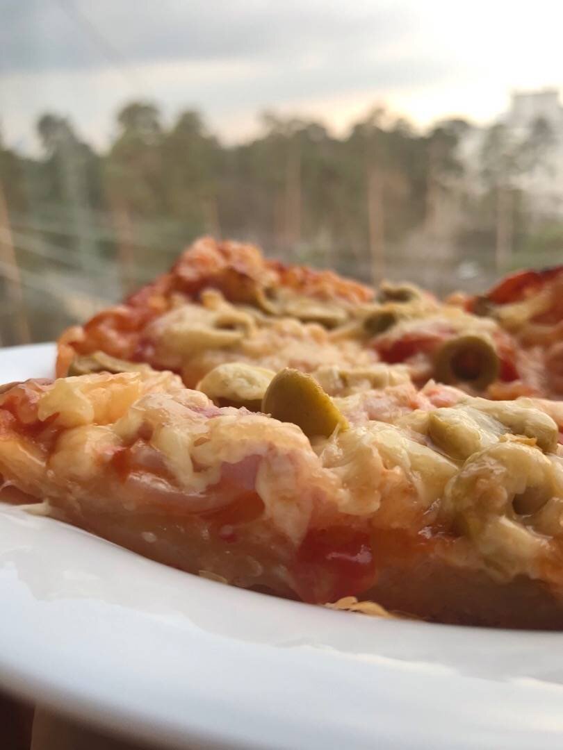 Коли дуже хочеться смачну піцу і не хочеться морочити голову з тістом я роблю її - піцу з листково-дріжджовим тістом з АТБ. Фішка рецепту в тому, що його можна модифікувати під себе: купити улюблений соус, взяти овочі, які до вподоби саме вам, замінити м‘ясо на гриби або креветки або просто використати те, що лишилось в холодильнику після застілля. Вмикайте фантазію! Ингредиенты: листи листково-дріжджового тіста з АТБ "Своя лінія";, Майонез + щоб зробити сітку;, Кетчуп;, Бекон (грудинка копчена) , маленька цибулина;, середніх помідори;, оливок консервованих;, твердого сиру Способ приготовления: Розморозити тісто; Поки тісто розморожується, подрібнити овочі, м'ясо та натерти сир; Розкачати тісто (товщина приблизно 5 мм), зробити дірочки виделкою; Викласти тісто на деко, перед тим змазане соняшниковою олією; Змішати в рівних пропорціях майонез і кетчуп та розприділити по тісту; Викласти нарізані інгрідієнти, посипати зверху сиром, і зробити сіку з майонезу (так сир не горітиме); Ставимо