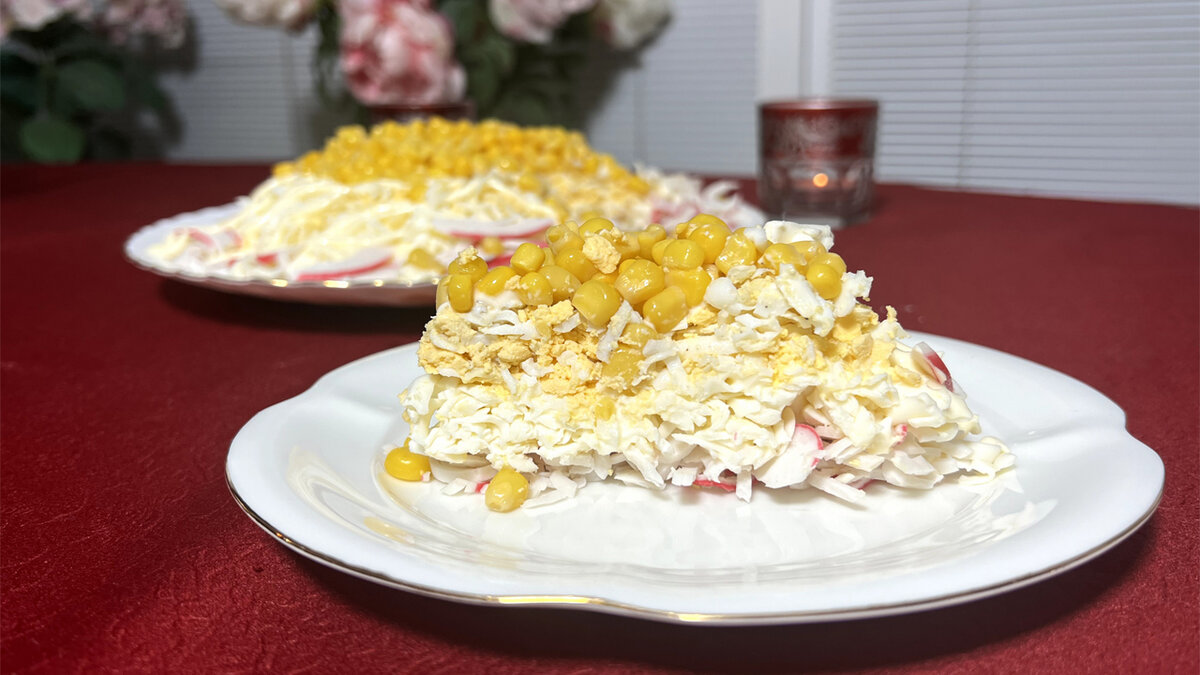 Всем большой привет , дорогие друзья ! Хочу с вами поделиться рецептом салата , очень вкусного , быстрого и легкого в приготовлении ! Отличный вариант , когда нужно подать что-то быстро на стол .Сохраняйте рецепт и готовьте с удовольствием ! ПОДРОБНЫЙ ВИДЕО РЕЦЕПТ ВЫ НАЙДЕТЕ НИЖЕ, А ТАК ЖЕ НА МОЕМ ЮТУБ КАНАЛЕ " ВКУСНАЯ ЕДА С ХАДИДЖЕЙ " Ингредиенты : Крабовые палочки ........200 гр Домашний майонез .....150-200 гр Яйца ...................................3 шт Соль.....................................щепотка Перец черный молотый ....по вкусу Кукуруза консервированная .....50-80 гр Плавленный сырок........2-3 шт Сопсоб приготовления Шаг 1 Нарезаем крабовые палочки на небольшие кусочки , выкладываем на плоскую тарелку и распределяем . Шаг 2 Сверху выкладываем сетку из майонеза . Поверх крабовых палочек натираем плавленный сырок на терке и распределяем вилкой . Выкладываем сетку из майонеза , по краю так же выложила перья из крабовых палочек, нарезала именно самую яркую часть .