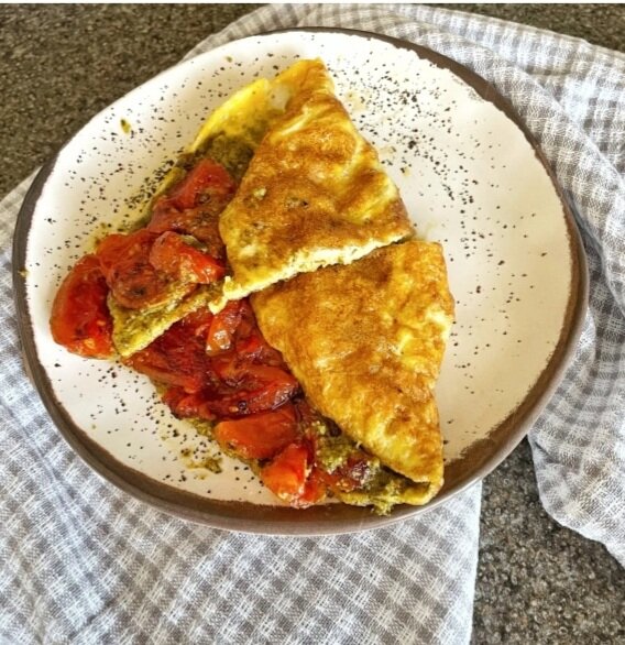 Давно у нас не было в блоге завтраков. Да что там завтраков, если посмотреть последние несколько записей, можно решить, что кроме выпечки мы ничего не едим. Поэтому срочно исправляюсь и делюсь простым, но оригинальным рецептом омлета. Его изюминка в соусе песто. При нагревании базилик раскрывается и источает особый вкус и аромат. А, в сочетании с теплыми, мягкими, слегка сладкими от прожарки помидорами это блюдо вообще становится вкусовой бомбой. У меня соус песто покупной, но конечно можно заморочиться и сделать самим. Я не стала. У едим много соуса песто, поэтому мне легче купить небольшую баночку, чем регулярно делать свежий. Ингредиенты: Яйцо – 3 шт. Оливковое масло – 3 ст.л. Помидоры Черри – 250 гр. Соус песто – 2-3 ст.л. Соль – по вкусу Приготовление: 1. На небольшой огонь ставим разогреваться сковороду с оливковым маслом. 2. Промытые и высушенные помидоры Черри разрезаем на 4 дольки. 3. Выкладываем их в разогретую сковороду и жарим, до тех пор пока они не станут мя
