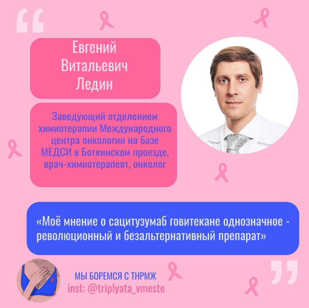 Сегодня хотим поделиться с Вами мнением о препарате сацитузумаб говитекан Евгения Витальевича Ледина Заведующего отделением химиотерапии Международного центра онкологии на базе МЕДСИ в Боткинском проезде, врач-химиотерапевт, онколог «Моё мнение о сацитузумаб говитекане однозначное - революционный и безальтернативный препарат» Многие наши женщин ждут этот препарат в России! Он применяется для лечения трижды негативного метастатического рака молочной железы #тнрмж #химиотерапия #трипл #ракмолочнойжелезы #говитекан #сацитузумабговитекан #ракдурак #триждынегативный #онкология #триплята