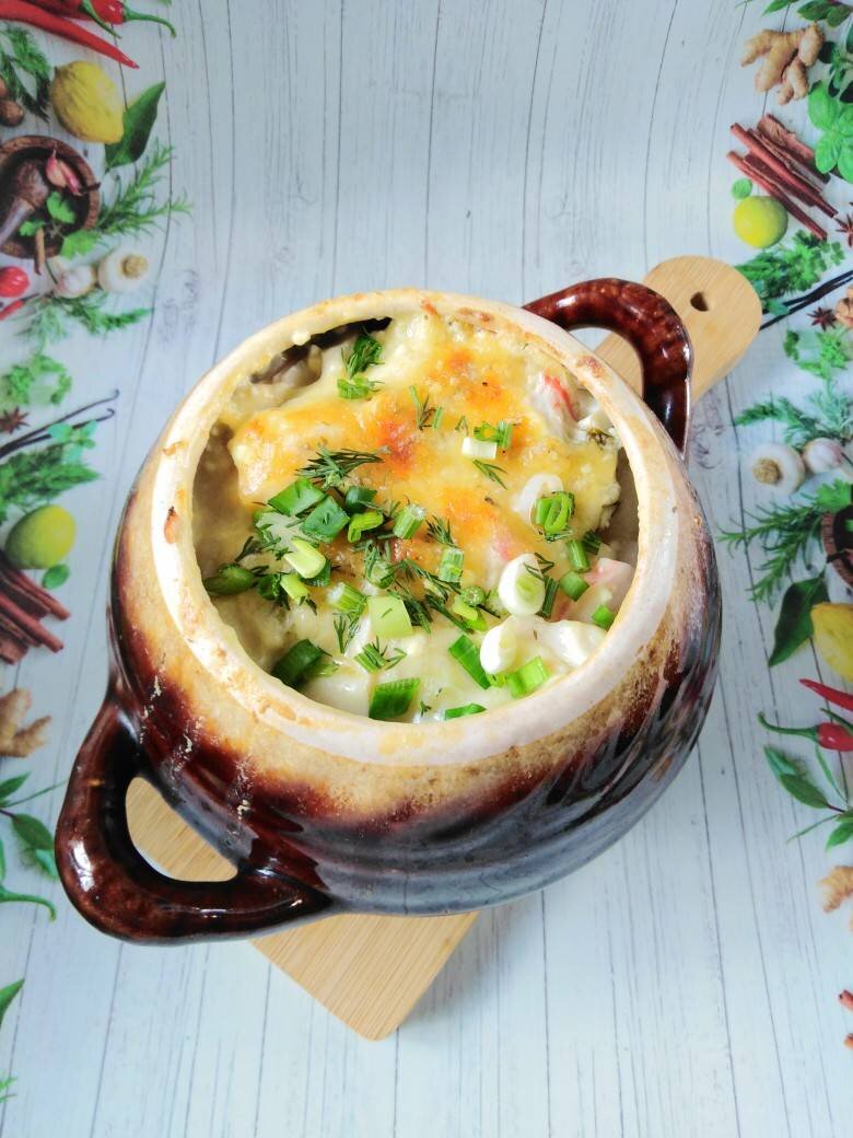 #пикник Сначала хотела приготовить пельмени по рецепту автора нашего сайта @folga Ольга Фараносова, но оказалось, что их у меня маловато и на ужин не хватит. Зато было крабовое мясо. А так как пельмени рыбные, то из них получился прекрасный дуэт! 🤗 Ингредиенты: рыбные пельмени, у меня из нерки, крабового мяса, твёрдый сыр, густой сметаны, Лимонной приправы для рыбы, воды, укропа Способ приготовления: Подготовить ингредиенты. Выложить слой пельменей на дно горшочка (у меня на 600 мл), сверху выложить слой крабового мяса. У меня вышло по 2 слоя. Сметану смешать с приправой, разбавить водой до полного стакана, залить в горшочек. Сверху посыпать укроп и поставить в холодную духовку. Разогреть до 180 градусов и запекать 15 - 20 минут (ориентируйтесь по своей - чтобы жидкость наполовину выкипела). Сыр натереть на круглой тёрке, засыпать в горшочек и вернуть в духовку на 10 минут - чтобы он зарумянился. При подаче посыпать зеленью. Приятного аппетита! Если вам понравился мой рецепт и вы приг