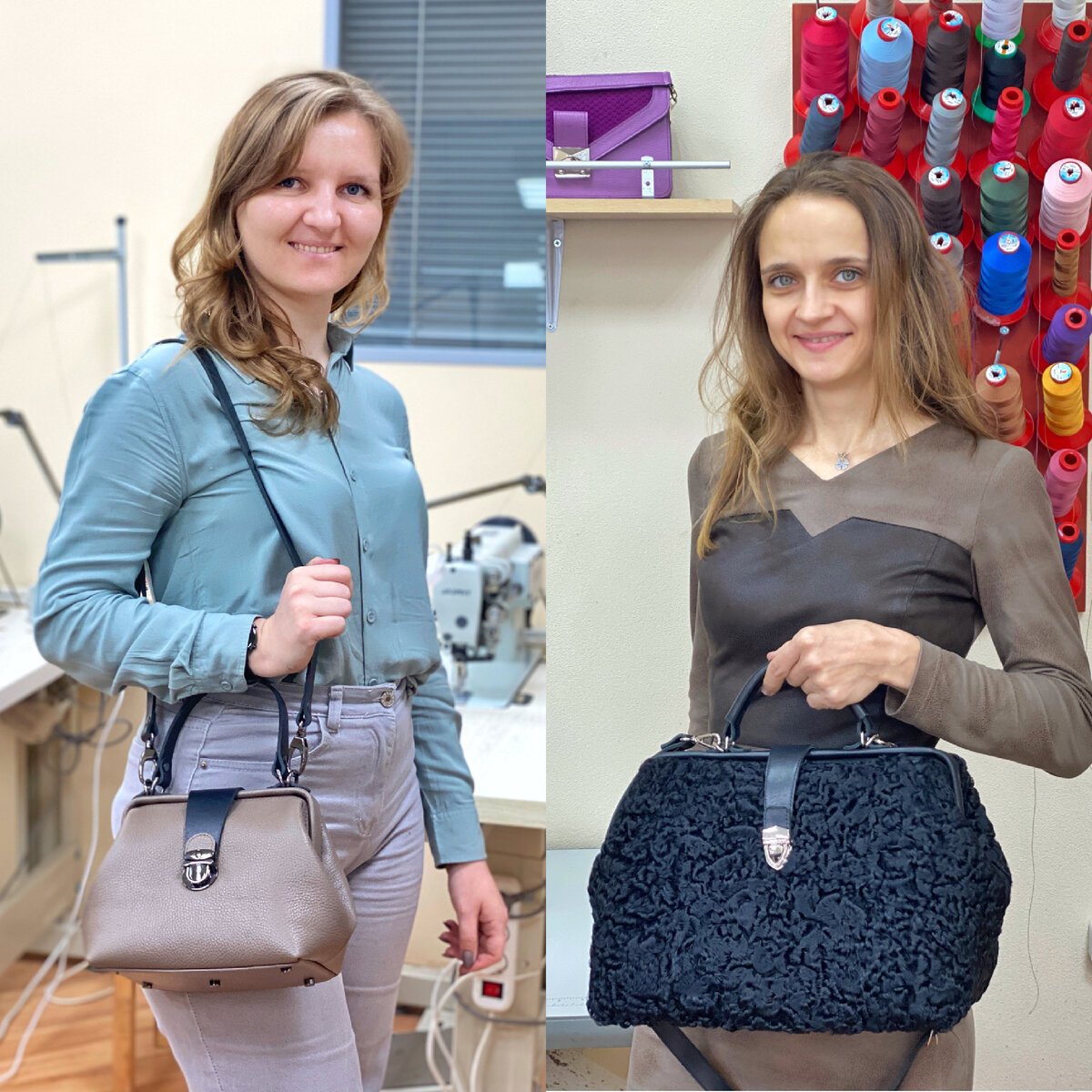 Виктория (слева) сшила свой саквояж на занятиях в Leatherschool за один день, а Ирина (справа) - за два. Почему так? Рассказываю. Саквояж Виктории сделан по упрощённой схеме. Что не умаляет его красоты и достоинств! У него клапан, ручка и ремень сделаны из ременной кожи и эти детали мы не отстрачивали. Это укорачивает срок изготовления. Так же у изделия нет кармашков. С саквояжем Ирины пришлось повозиться. Вместо кожи у нас был мех, и это стало для меня неожиданностью. Ира прямо в классе разрезала старую шубу из каракуля! Пришлось на ходу соображать, как скрепить детали и как изменить выкройку, чтобы место под рамы оставить кожаным. Внутри саквояжа есть карманы: два накладных и один на молнии. На задней стенке тоже есть карман на молнии в кожаной рамке. Ручка, клапан и ремень - двусторонние. То есть мы склеивали кожу и отстрачивали детали по периметру. Конечно, это дольше, чем просто вырезать. Какой саквояжик вам нравится больше? Мини или меховой? Записаться на 1-дневный или 2-дн