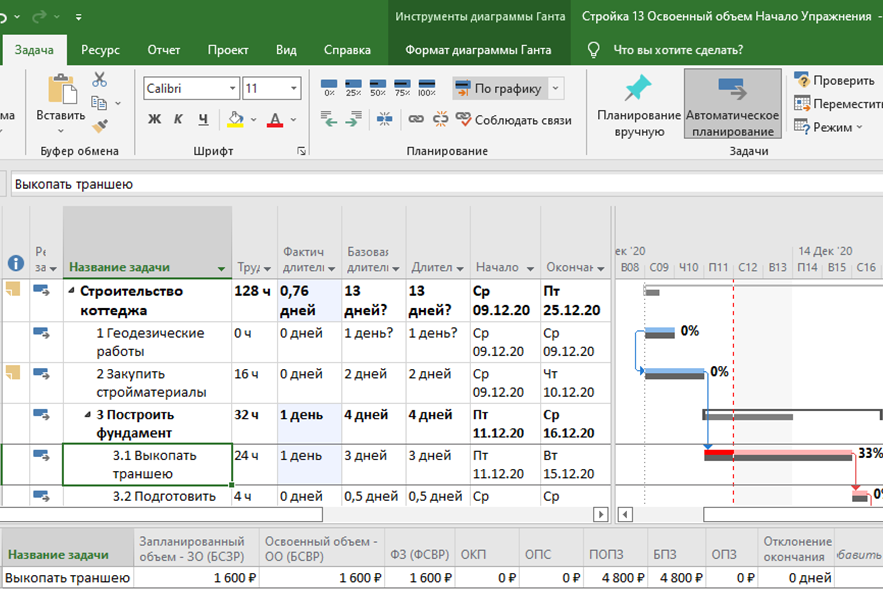 Метод освоенного объема (МОО) (Earned Value Analysis) - широко используемый в практике управления проектами способ контроля хода выполнения проекта по стоимостным показателям. Базовые основы метода рассмотрены в 1-й Части Урока 13. MS Project некоторые показатели хода работ вычисляет по-разному для разных типов задач. Пример для задачи, имеющей тип Фиксированная длительность Фиксированный объем работ рассмотрен в Части 2. Урока 13. На этой странице в Части 3. Урока 13 рассмотрим пример для задачи, имеющей тип Фиксированные трудозатраты. Откроем файл Стройка 13 Освоенный объем Начало Упражнения. Установим задаче Выкопать траншею тип задачи Фиксированные трудозатраты. Сохраним файл проекта под именем Стройка 13 Освоенный объем Начало Упражнения Фикс трудозатраты Рассмотрим примеры вариантов некоторых возможных ситуаций, которые могут сложиться на этапе отслеживания хода выполнения проекта. Вариант 1. Все идет по утвержденному графику работ. Выполним команды Задача – Планирование - По гр