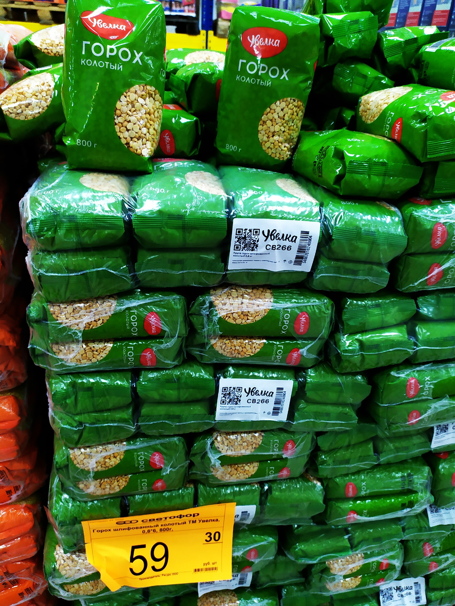 Вроде "лёд тронулся" и в "Светофоре" вновь начали завозить популярные товары, к которым уже все привыкли. И я заметил, что практически все покупатели, при выходе из магазина были с положительными эмоциями держа в руках по 2-3 пакета. В этом обзоре хочу поделиться увиденным в торговом зале "Светофора" города Крымск. Горох колотый и шлифованный "Увелка", массой 800 грамм. Цена 59 рублей. Лапша лагманная из твердых сортов пшеницы, массой 450 грамм. Цена 34 рубля. Макаронные изделия пёрышки от производителя "Твёрдый знак", в упаковке 3 кг. Цена 141 рубль. Мороженая неплохая мойва и практически вся с икрой. Цена 164 рубля за 1 кг. Охлаждённая свинина на кости со шкурой. Цена 192 рубля за 1 кг. Постоянно подвозят куриные яйца С 1. Сегодня они продаются по цене 175 рублей за 30 штук. Твёрдый и солёный "Балаганчик" из курицы в вакуумной упаковке, массой 200 грамм. Цена 183 рубля. В вакуумной упаковке свиной "Орех мясной". Цена 384 рубля за 1 кг. Молоко цельное сгущённое с сахаром, в мягкой упа