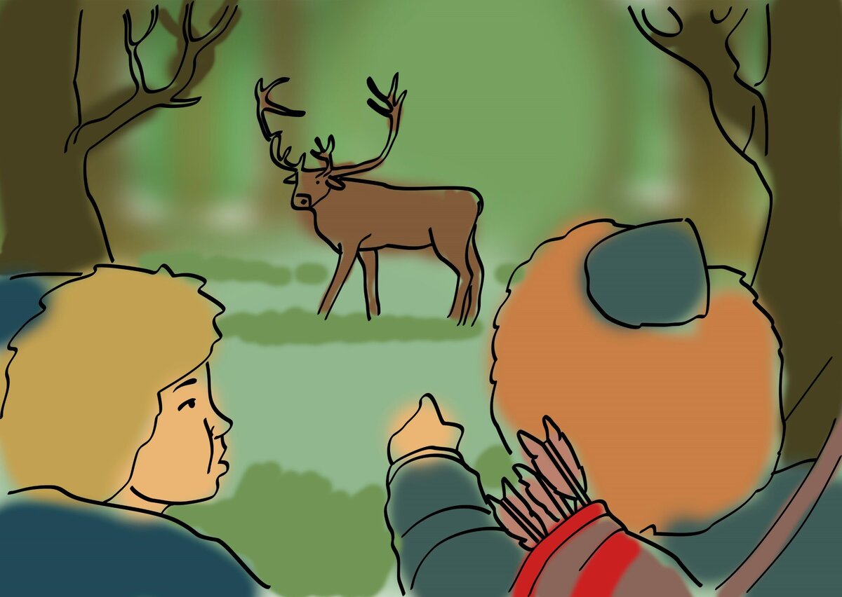 Башкирская сказка Во времена давние жили в Башкирии отец с сыном. Отца звали Юрханы. Он был старым, опытным охотником. Знал все тропы в лесу. Читал следы, как открытую книгу. Ведал хитрости и повадки всех зверей лесных. А когда его сын Юлдыбай подрос, то стал с отцом на охоту ходить. Слушал внимательно, все премудрости охотничьи запоминал. – Не встречал я более верного и надёжного товарища, чем ты, мой сын! – сказал однажды Юрханы. Молодого охотника эти слова очень обрадовали. И вот умер Юрханы. Оставил жену и сына одних. Юлдыбай к тому времени сильным и храбрым юношей стал. Ходил он на охоту в самые дремучие леса. Всегда с добычей возвращался. Хватало и себя, и мать прокормить. Однажды попросились с ним двое егетов, его ровесников: – Ты самый умелый охотник, Юлдыбай. Научи и нас охотиться! Юлдыбаю понравилось, что они уважительно обратились к нему. И он согласился взять их на охоту. (*егет – юноша по-башкирски) Дело было летом. Лес стоял зелёный и красивый. Много дичи в нём водилос