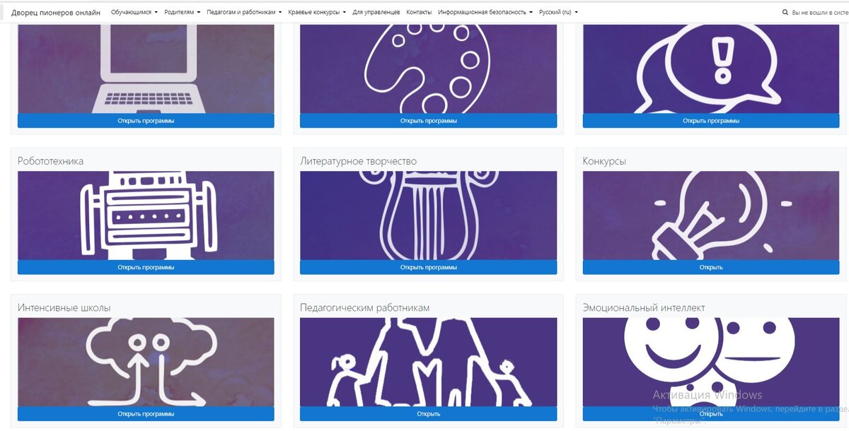 Красноярский краевой дворец пионеров онлайн, www.online.dvpion.ru На сайте реализуются дополнительные общеразвивающие программы технической, художественной, социально-гуманитарной направленности. Интенсивные школы. Краевые конкурсные мероприятия или их этапы. Для обучающихся 7-18 лет. Техническая направленность программы: Магия оригами, Мультикадр (программирование), Основы моделирования дизайна интерьеров, Программирование игр и приложений, Основы сайтостроения, Сними это красиво, Hello, робот Художественная направленность Палитра творчества Социально-гуманитарная направленность Блогинг, учимся писать тексты. Развитие культуры речи.Филологическая мастерская. Фабрика мысли (основы проектной деятельности), Эстафета (безопасное поведение на дороге), школа ЮИД, Школа стартапа "START UP SCHOOL", Жизнь в стиле медиа, МАСТЕР стартап, Определяй свое будущее Интенсивные школы Школа инженерных команд Краевой школьный парламент Школа молодого предпринимателя "Бизнес - класс" Краевые конкурсы Зн