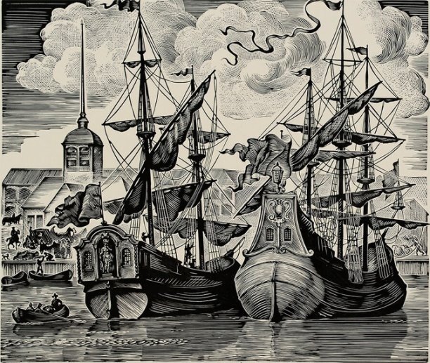 В совершенстве владея языком гравюры, художник изображает наполненные ветром паруса, деревянные корпуса судов, резные фигуры, медь пушек и блеск волн.