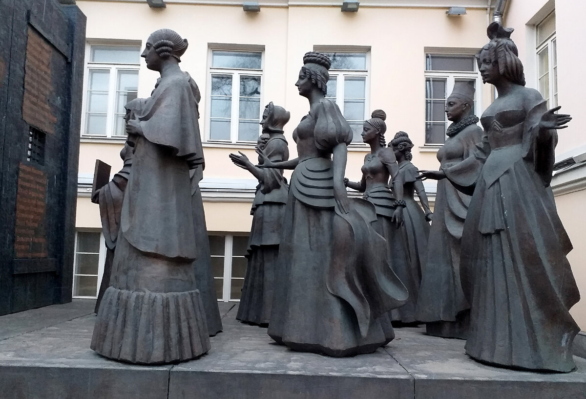 Этот монумент находится во дворе Музея современного искусства в Москве, что на Гоголевском бульваре, 10, стр.1. Посвящается цвету российского общества начала 19 века, женщинам, которые решились на путешествие к центру земли Русской, оставив роскошные дома, родных, комфортный быт, ведомые верностью и любовью в высшем христианском смысле ее, любовью к своим суженным половинкам, осужденными за попытку распахнуть двери Свободы на своей овитой сетью сосальщиков Земле.