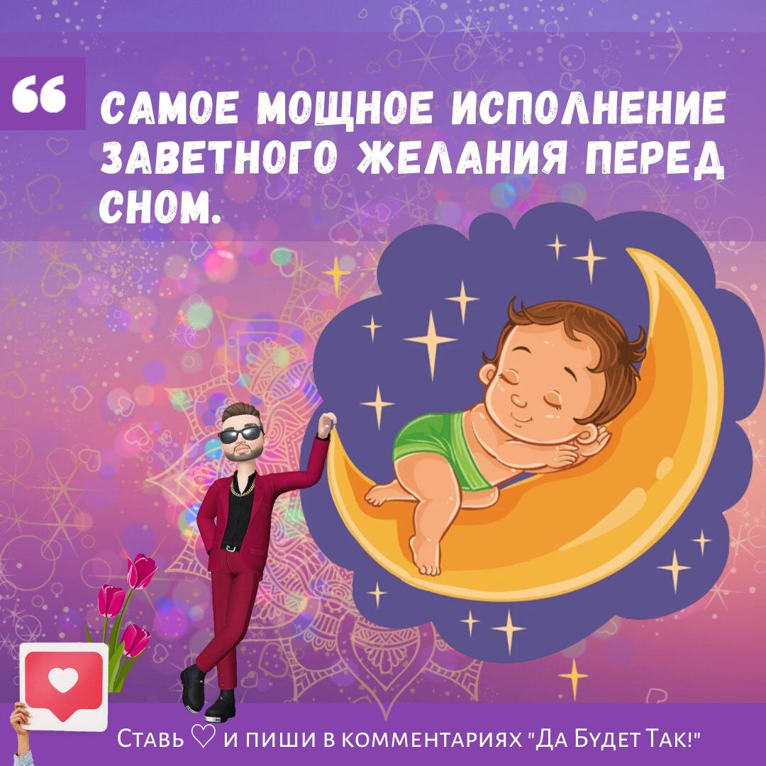 Вы знаете, что желания, которые мы загадываем перед сном, самые быстро исполняемые? В фазе сна, когда мы уже почти засыпаем, и думаем о чем-то, вот это время самое самое, чтобы отправить во вселенную заветные желания. Что нужно знать при загадывании желания? 1. Оно должно быть очень желанным. Обязательно должны понять, что стоит на первом месте в ваших мечтах. Да возможно, вы хотите квартиру, но прямо сейчас важнее сапоги, поэтому нужно выделить, главное. 2. Желание должно быть экологичным и касаться только вас. ТО есть вы не можете желать, чтобы муж или сын нашел работу. Они могут желать чего-то другого, а найти работу им хотите именно вы. Поэтому, желайте для себя и никогда не желайте, нанести вред кому-либо. 3. Желание должно быть реальным. То есть, если хотите шапку из пучка шерсти волшебного пони, то вряд ли оно исполнится, сами понимаете. 4. При засыпании, представьте желание детально на сколько возможно. Даже пусть это будет запах, который ассоциируется с желанием, цвет, размер