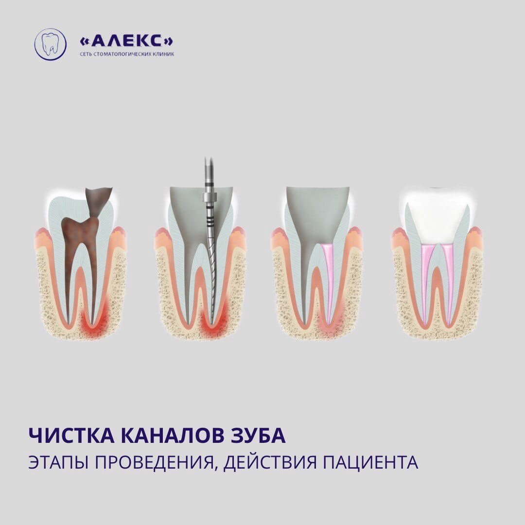 Чтобы качественно очистить зубные каналы, врач-стоматолог осуществляет следующие манипуляции (поэтапно): Коффердам изолирует рабочее поле от посторонних жидкостей, а значит и от множества бактерий, которые могут попасть в свежеочищенные зубные каналы. На этом этапе врач высверливает в зубе отверстие. При помощи стоматологического бора специалист через крошечное отверстие попадает в пульпарную камеру больного зуба. Для очистки внутренней поверхности зубной полости стоматолог использует специальные файлы. Врач проводит манипуляции с каналами, оперируя несколькими файлами разного диаметра - от меньшего к большему. В процессе очистки он параллельно промывает полость зуба, чтобы досконально очистить канал зуба по всей его длине. 4. Закрытие зубного канала пломбировочным материалом. Первые несколько дней после чистки зубных каналов, зубы могут приобретать повышенную чувствительность. Пациентам следует знать, что это совершенно нормально, а для уменьшения дискомфорта достаточно принять анальг
