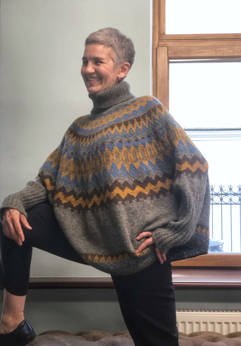Эту модель вязала некоторое время назад, когда у меня не было вязальной машины. Сейчас, когда подготовка к выставке «Гранд текстиль» идёт полным ходом, достала из загашника это свончо. Свончо - гибрид свитера свободного кроя и пончо. Автор модели дизайнер Caitlin Hunter. Описание можно найти в интернете в открытом доступе или купить. Не люблю попетельные готовые описания, приходится подгонять под себя, в процессе вносить изменения. В этом случае удлинила модель, добавила узор, изменила горловину. Свитер массивный и из этой массы торчала тонкая шея, по-этому связала высокий воротник. Свитер уютный в скандинавском стиле связан геометрическим жаккардовым узором. Вязать жаккард увлекательно. Когда на спицах 450 петель приходит состояние покоя и умиротворения. Петля следует за петлей, складывается в узор - медитация. Свончо вязала сверху вниз. Горловину формировала укороченными рядами. Рукава связаны резинкой, намеренно вязала длинными. В низу изделия резинка. ◾️Пря