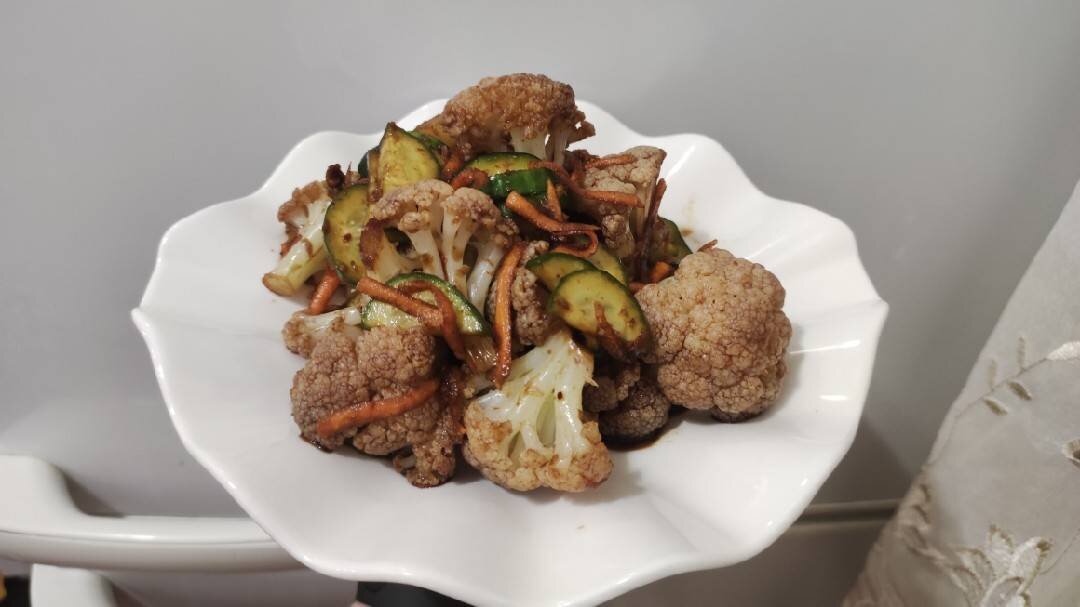 Цветная капуста по-корейски с морковью и огурцами понравится тем, кто любит салаты по-корейски или кто любит острую пищу. Я, например, обожаю острые салаты. Такой салатик прекрасно подойдет к отбивным, плову, шашлыкам и т.д. #домавкуснее Ингредиенты: Капуста цветная , Морковь, Огурцы, Чеснок, Соевый соус , Уксус 6 %. , Сахар , Соль , Кориандр , Перец красный жгучий , Масло растительное Способ приготовления: Для начала нужно отварить цветную капусту. Ставим кастрюлю с водой и ждем пока закипит. Затем бросаем цветную капусту разобранную на соцветия. Отвариваем после закипания две минуты. Сливаем воду и даем капусте остыть. А пока капуста остывает, натрем морковь на терке для корейской морковки. Огурцы режем полукругами. В миске смешиваем специи: молотый кориандр, сахар, соль, красный острый перец и пропущенный через пресс чеснок. Затем кладем соевый соус, уксус и масло растительное (я использовала кунжутное) Перемешиваем. Смешиваем капусту заранее остывшую, морковь и огурцы. Поливаем лож