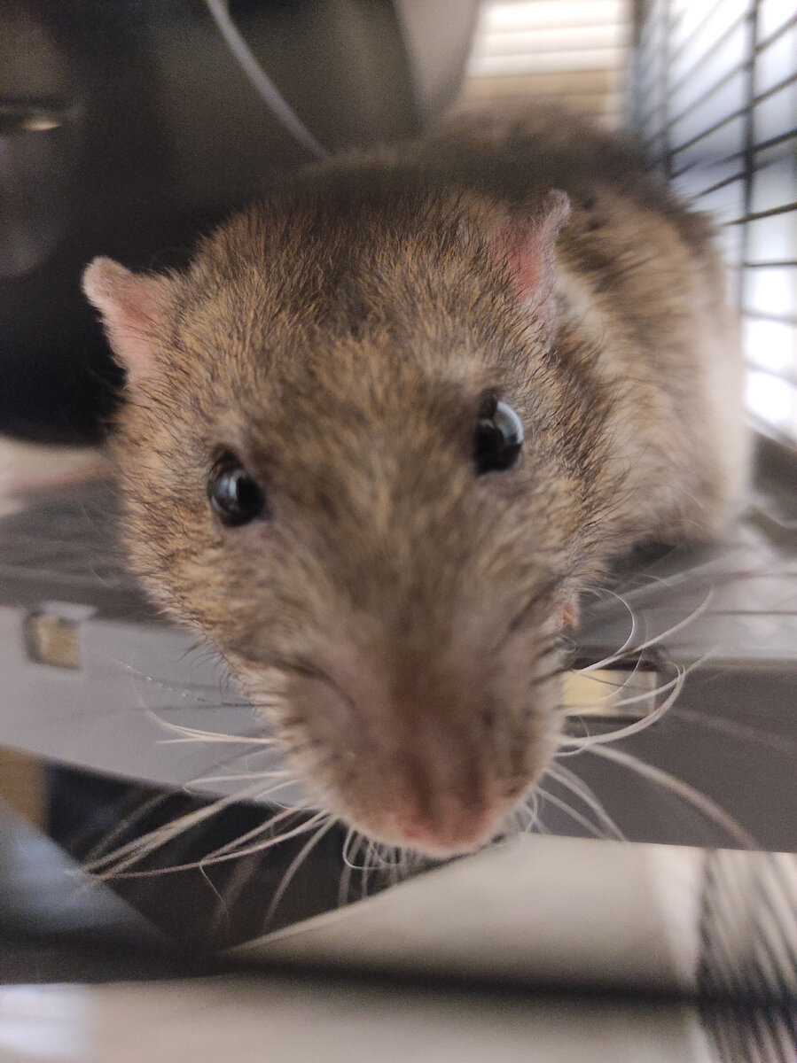 Кучеряш ко мне приехал в возрасте около 8 месяцев. История его проста и трагична. Его привезли на передержку к крысоводу с формулировкой "нужно уехать на три месяца", заплатили за три недели и с тех пор хозяйка больше не выходила на связь. На сегодняшний день с того события прошло чуть меньше года. И это, пожалуй, было лучшее развитие событий, тк приехал он в крошечной грязной клеточке с плесневым куском хлеба. Мне как раз нужен был товарищ для своей Мышуси и я его забрала к себе после кастрации. Кучеряш отсидел положенный карантин и настал тот самый момент, когда крысы встретились на чистом пледике. Поскольку, Кучеряш до этого все время жил один и обладал характером, мягко говоря, трусливым, то увидев Мышусю он сделал самое логичное, что было возможно в этой ситуации - сбежал. Сбежал он в дом, забаррикадировал его салфетками и на контакт выходить отказался. Собственно, на этом первая встреча и закончилась, Мышуся была отправлена домой, а Кучеряш милостиво согласился обменять домик на
