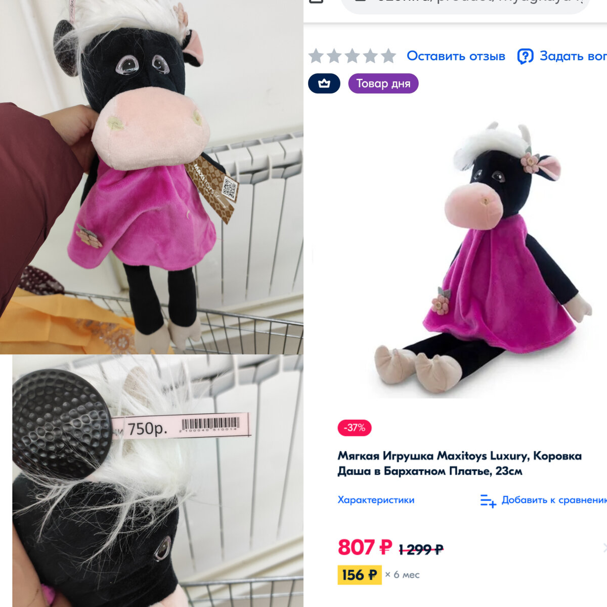 Всем привет! Меня зовут Настя, я живу в Екатеринбурге, и сегодня я опять сделала обзор о магазине Зигзаг Удачи. Действительно, это удача, что я живу рядом, и можно зайти посмотреть на разнообразие товаров, даже ничего не приобретая. Особенно в день завоза. Обзор я собрала из магазина, когда были дни новых завозов. Находки, которые я не купила, но они привлекли мое внимание. Продавцы говорят, что перед открытием по субботам стоит огромное количество людей и в первые часы "сметают" большую часть выставляемого товара. Я пришла после часу дня, и в кассу стояло в три ряда очередь, полагаю, это те самые ранние пташки уже прошлись за эти часы по магазину и уже стоят с полными тележками на кассе. Ну, а я иду в полной уверенности, что и для меня интересное осталось. 1. Бурёнка Даша. Новая с биркой. Цена 750 рублей. Было две штуки, полагаю магазин сдал как неликвид, потому что были ещё новые игрушки. Только цену Зигзаг ставит на все новое на порядок выше, чем без бирок. Получается почти как