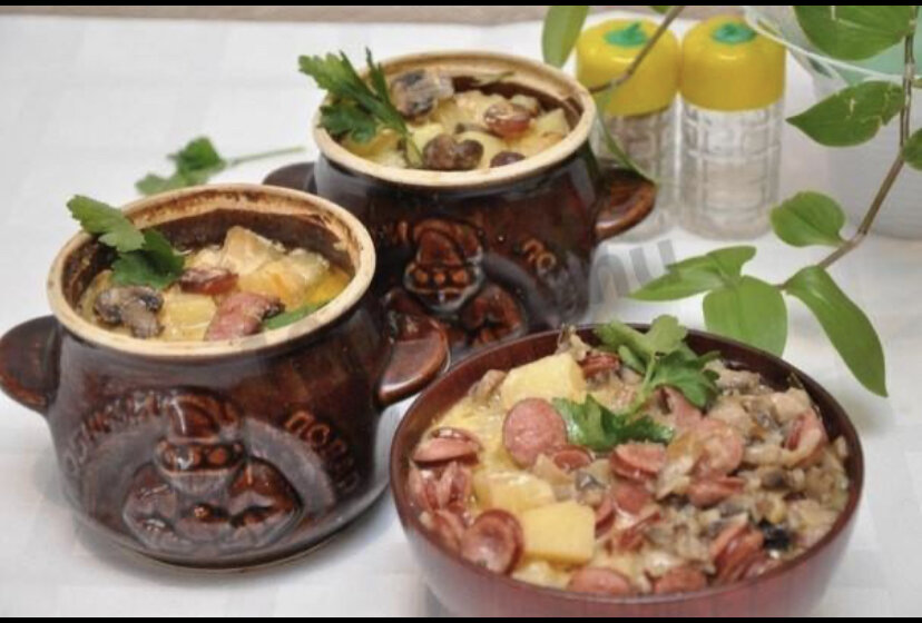 Ингредиенты: На 4 горшочка: картофель – 1 кг, охотничьи колбаски – 6 штук, репчатый лук – 2 штуки, шампиньоны – 200 г, сметана – 1 стакан, бульон – 700 мл, сладкая паприка – 1 ч. ложка, растительное масло для обжарки, соль, перец горошком, зелень, лавровый лист по вкусу. Приготовление: Картофель почистить, нарезать небольшими кубиками и чуть обжарить в растительном масле. Лук мелко порезать и обжарить вместе с грибами. Колбаску порезать кружочками. Класть в горшочки слоями: грибы с луком, охотничьи колбаски, картофель. Сметану смешать с бульоном, посолить, поперчить и залить в горшочки. Поставить в холодную духовку и готовить при температуре 150 С около часа. Перед подачей посыпать зеленью. Приятного аппетита!