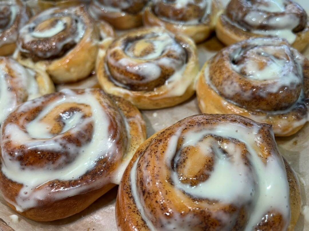 Самые вкусные американские булочки с корицей. Домашние все смели. Желательно их съесть пока они горячие. Надеюсь рецепт вам понравится. Приятной готовки! Ингредиенты: Тесто:, мука, теплое молоко, сахар, сливочное масло, сухие дрожжи, яйцо, соль, Начинка:, коричневый сахар, корица, сливочное масло, Крем:, сахарная пудра, сметана Способ приготовления: В теплое молоко добавить щепотку соли, дрожжи и сахар, перемешать все. Дать постоять 10 минут. Добавить яйца, мягкое сливочное масло, перемешать. В три подхода добавить просеянную муку, замесить тесто. Тесту дать отдохнуть 1 час, закрыть пищевой пленкой. Должно подняться на 2-3 раза больше. Тесто раскатать в пласт с толщиной 2-3 см. Смазать растопленным сливочным маслом, посыпать корицу и коричневый сахар. Свернуть в плотный рулет, разделить на 16 частей. Дальше накрыть полотенцем и оставить подниматься на 40 минут. Выпекать 25-30 минут при 180С. Готовим крем. В сметану добавить сахарную пудру, перемешать хорошенько. На горячие синнабоны на