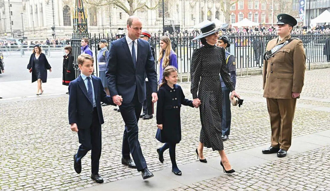 К герцогу и герцогине Кембриджской присоединились их старшие дети, принц Джордж и принцесса Шарлотта, когда они отправились на службу благодарения в честь покойного принца Филиппа. Восьмилетний Джордж и шестилетняя Шарлотта, которые ранее не были включены в список королевских гостей, неожиданно появились в Вестминстерском аббатстве. Их младший брат, принц Луи еще слишком мал, чтобы присутствовать на подобном мероприятии. Джордж был одет темно-синий костюм, а Лотти в такого же цвета пальто и колготки. Они прибыли в аббатство держа за руки своих родителей. Принц Джордж шел вместе со своим отцом принцем Уильямом, а Лотти шла с мамой Кэтрин Миддлтон. 40-летняя герцогиня выглядела элегантно в черном платье в горох и широкополой шляпе. Королевское семейство приветствовал преподобный доктор Дэвид Хойл, декан Вестминстера. Ее Величество прибыла последней из королевской партии. К благодарственной службе принца Филиппа присоединились принц Чарльз и Камилла Паркер-Боулз, принцесса Анна и сэр