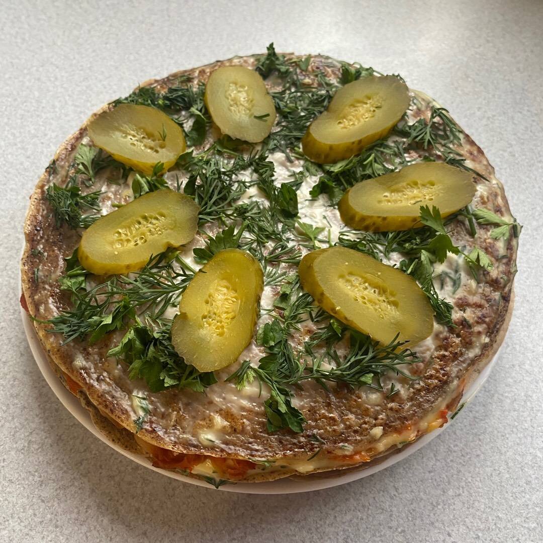 Ингредиенты: Для млинців:, куряча печінка, молока + 1 склянка для замочування, борошна, яйця, сіль, Для начинки:, моркви, середніх цибулин, солоних огірків, часник, зелені (кріп, петрушка), майонезу Способ приготовления: Вимити печінку, прибрати згустки крові та прожилки. Замочити в молоці на 30 хвилин. Робимо зажарку. Натираємо моркву, шинкуємо цибулю. На розігріту сковорідку наливаємо олію (я беру оливкову). Жаримо цибулю до золотистого кольору. Добавляємо до цибулі моркву, та жаримо до готовності. Беремо 3 солоних огірка і натераємо на терці, кладемо на сито, щоб стекла вся рідина. 1 огірок тоненько нарізаємо слайсами для декору. Зливаємо молоко з печінки та починаємо готувати млинці. В чашу з блендером кладемо: печінку, молоко. яйця, сіль, борошно. Взбиваємо до однорідності. На розігрітій сковорідці жаримо млинці з обох сторін по 1-2 хв, до готовності. Робимо соус: змішуємо майонез, часник та кріп. Складаємо торт: млинець → соус → зажарка → млинець → соус → натертий солений огірок