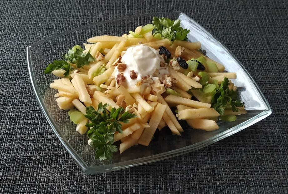#пикник Ингредиенты: черешки ревеня, большое яблоко, изюм, ядро грецкого ореха, йогурт домашний, петрушка Способ приготовления: Черешки ревеня очистить от кожуры и тонко нарезать. Яблоко очистить от кожуры, нарезать соломкой. Изюм залить кипятком, дать постоять пару минут. Затем слить воду. Ядро грецкого ореха крупно нарезать. Салат заправить йогуртом и посыпать орехами. Я для заправки взяла творожный Даниссимо со вкусом пломбира. Можно добавить зелень петрушки. По мотивам рецепта сайта gastronom.ru