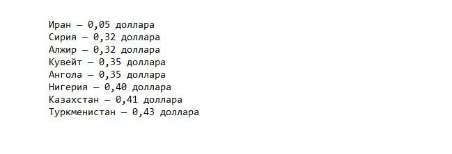 далее - Нидерланды с 2.6 , Норвегия с 2.5. Ну и список по убывающей цене: Можно спросить - ну и где в списках Россия? Условно посередине, с учетом колебания курса доллара можно в среднем подсчитать только - около 0,7 - 0.8 долларов за литр. Ну и немного про нефть: в мире потребляется в день около 100 миллионов баррелей, причем первенство держит США с их 21 миллионами,