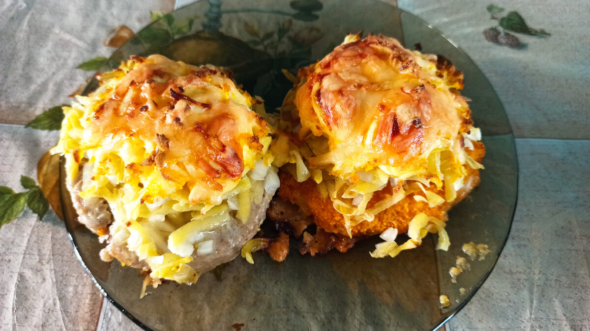 Воскресный день. Вся семья дома. Чем же удивить близких? Вспомнила старый рецепт и решила предложить вам приготовить ужин выходного дня. Для начала подготовим все ингредиенты. Во-первых нужно взять мясную основу: отбивную, фарш или котлетку. В этот раз я решила попробовать котлетки, приобретённые мною в магазине "Ермолино". Выкладываем на противень, покрытой бумагой для запекания котлетки. Бумагу предварительно нужно смазать маслом. Можно брать разное мясо. У меня свиные котлеты и куриные с ветчиной и сыром. Далее заготавливаем остальные ингредиенты. На крупную тёрку натираем свежий картофель, предварительно отваренные яйца и сыр. Лук мелко нарезаем. Далее перемешиваем картофель и лук. Немного присолим. На котлеты сверху накладываем картофель. И немного смазываем майонезом. Сверху посыпаем яйцом. И снова майонез. На самый верх горки кладём сыр. Вот что у нас получилось. Отправляем в духовку на 30-40 минут. И вот наш ужин готов. ПРИЯТНОГО АППЕТИТА! А у вас есть семейные рецепты? Вы го