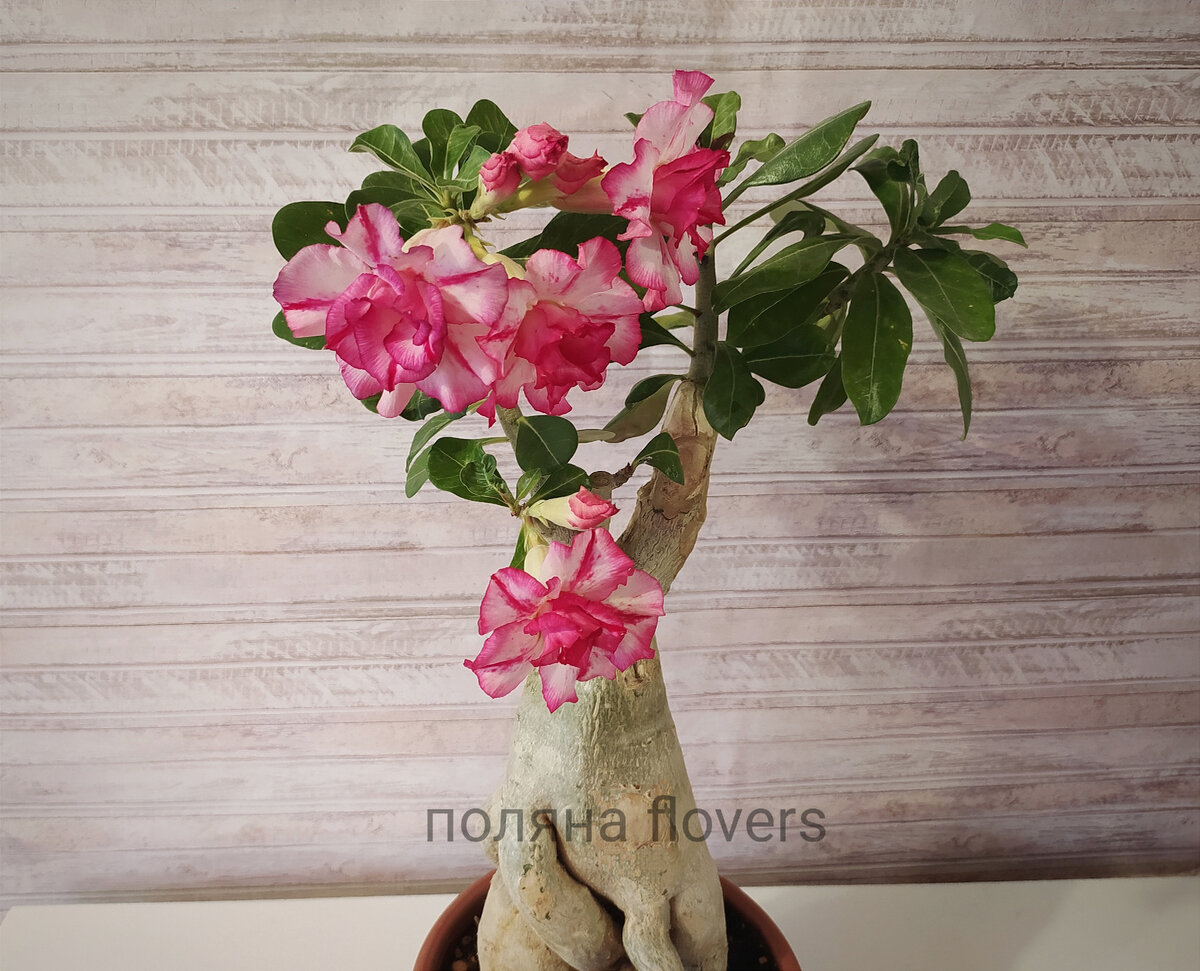 Она была обладательницей поистине необыкновенного растения, которое когда-то посадила небольшим семенем, а теперь оно гордо красовалось на её столе, мило подмигивая лепестками роскошных бутонов. Они были расписаны чудными красками : и ярким розовым перламутром, и блестящим серебром, наделённые своеобразным узором прекрасным и привлекательным. Цветы не являлись его родными , от природы он был простой,не махровый ,,пинк,, и только благодаря объединению частей нескольких растений бутоны на его практически древовидных ветках могли иметь махровые цветы разного цвета. Это милое, чистое создание, никому не делающее вреда медленно ,но верно заполняло цветочный горшок своим мощным и внушительным резервуаром для воды в ботанике именуемым как каудекс к слову сказать, размер которого в диаметре достигал уже 36 см) Некогда Роза пустыни теперь по праву является розой- Сибири. Она ласково называет его Адешка , в то время как по паспорту он был Адениум тучный, или Адениум толстый (лат. Adeniu
