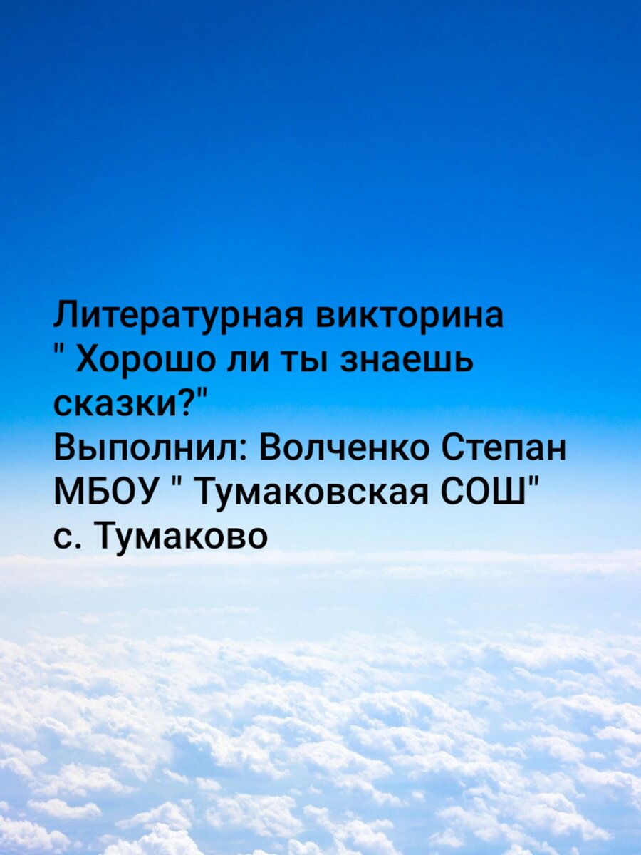 Литературная викторина «Хорошо ли ты знаешь сказки?» 1. Назовите единственную героиню сказки «Репка», имя которой нам известно?(Жучка) 2. Имя царя, пославшего Ивана-царевича за жар –птицей?(Берендей). 3. Река, у которой сражался Иван- крестьянский сын?(Смородина). 4. Каким ласковым словом очень часто называют своих отцов герои русских сказок? (Батюшка) 5. Как звали царя, у которого Иван-царевич похитил Жар-птицу в сказке «Иван-царевич и серый волк»? ( Афрон). 6. Как в русской народной сказке «Никита Кожемяка» названо жилище змея-людоеда? ( Берлога) 7. Что напекла злая мачеха на несостоявшиеся поминки по своей падчерице в русской народной сказке «Морозко»? ( Блины). 8. Что затеяли две главные героини русской народной сказки «Правда и Кривда»? (Спор) 9. Как звали царевну, ставшей женой Иванушки-дурачка в русской народной сказке «Сивка-бурка»? ( Елена). 10. Какой страшный предмет, надетый на палку, дала Василисе в качестве источника света Баба Яга? ( Череп). 11. Кто посылал Емелю из с