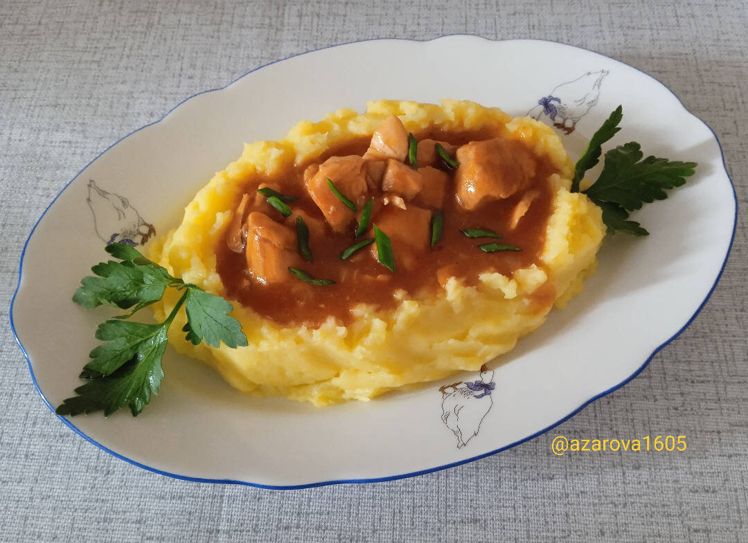 Ингредиенты: филе индейки, репчатого лука, растительного масла, сливочного масла, муки, томатного сока, лаврового листа, соль и перец , средние картофелины, молока, сливочного масла