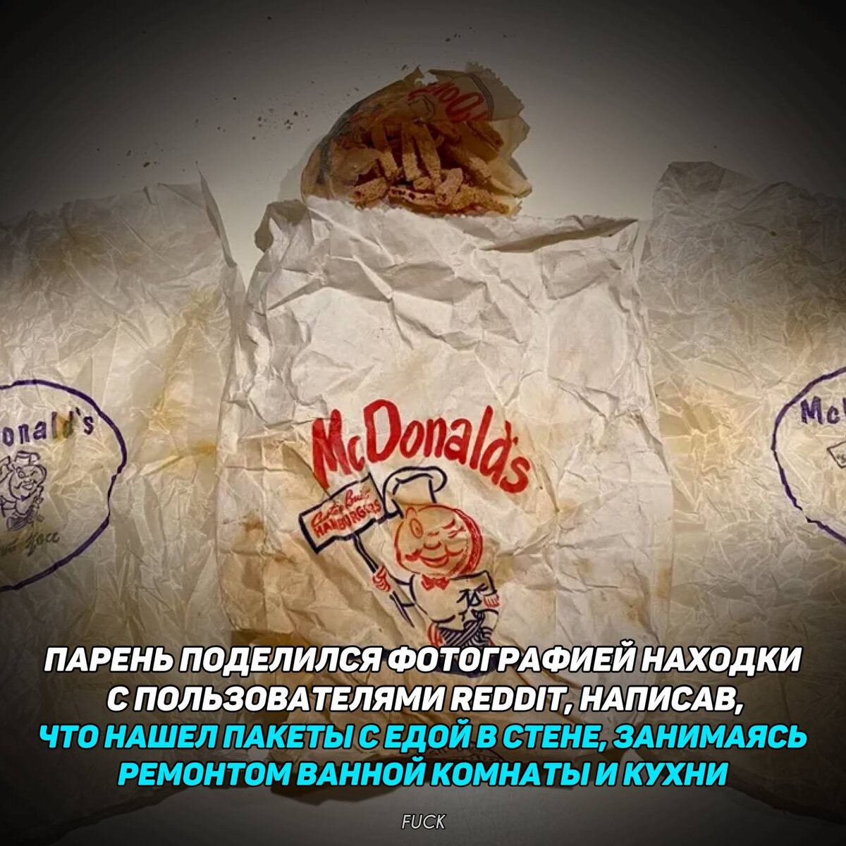 парень поделился фотографией находки с пользователями REDDIT, написав, что нашел пакеты с едой в стене, занимаясь ремонтом ванной комнаты и кухни.