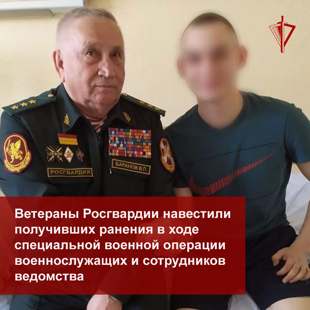 В преддверии Дня Победы советник директора Росгвардии генерал-полковник в отставке Валерий Баранов и председатель совета ветеранов Главного военного клинического госпиталя Росгвардии полковник медицинской службы в отставке Сергей Бурмистров посетили военнослужащих и сотрудников ведомства, получивших ранения в ходе специальной военной операции и находящихся в настоящее время на излечении. Генерал-полковник Баранов обратился к росгвардейцам со словами поддержки, выразил им горячую благодарность за мужество и профессионализм, вручил подарки и пожелал скорейшего выздоровления.
