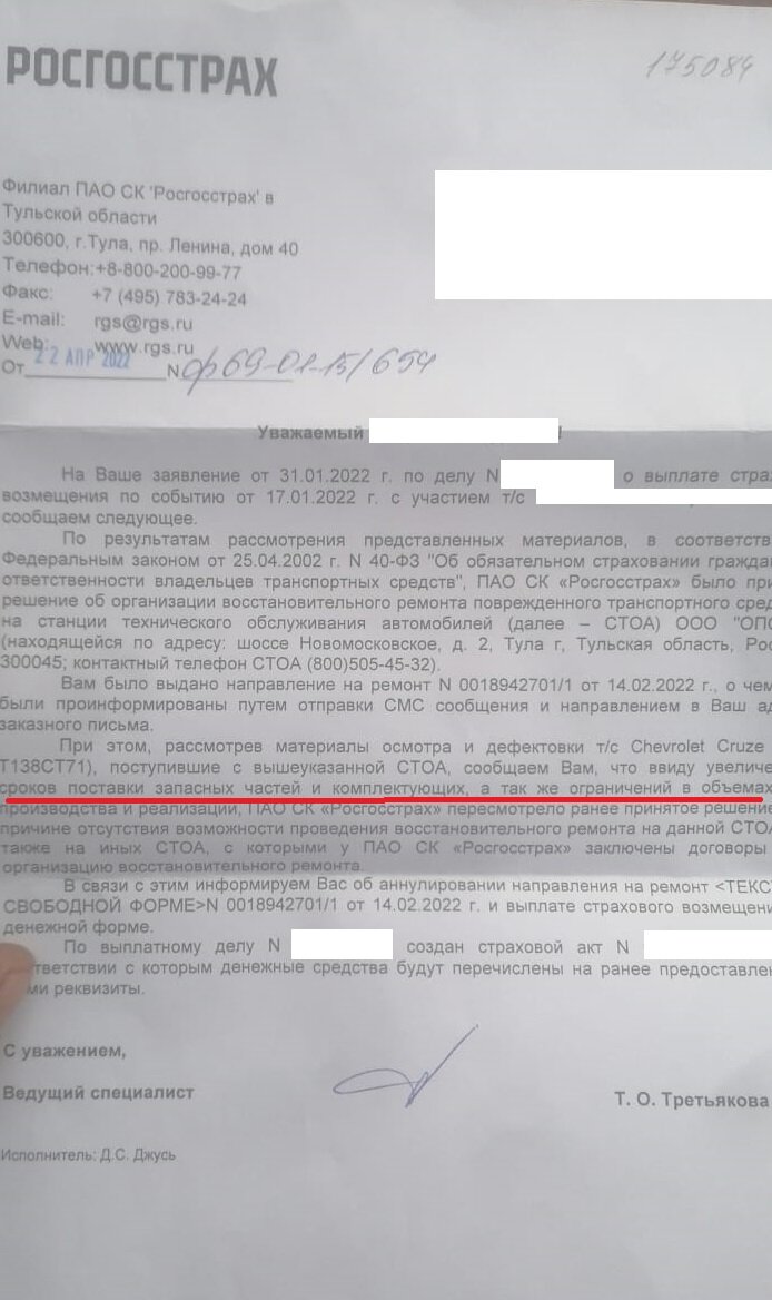 В связи с увеличением сроков поставки запчастей, СК Росгосстрах аннулирует направление на ремонт и выплачивает вам деньги по старым реквизитам. Ну и чьи это проблемы ? Автовладельцев?