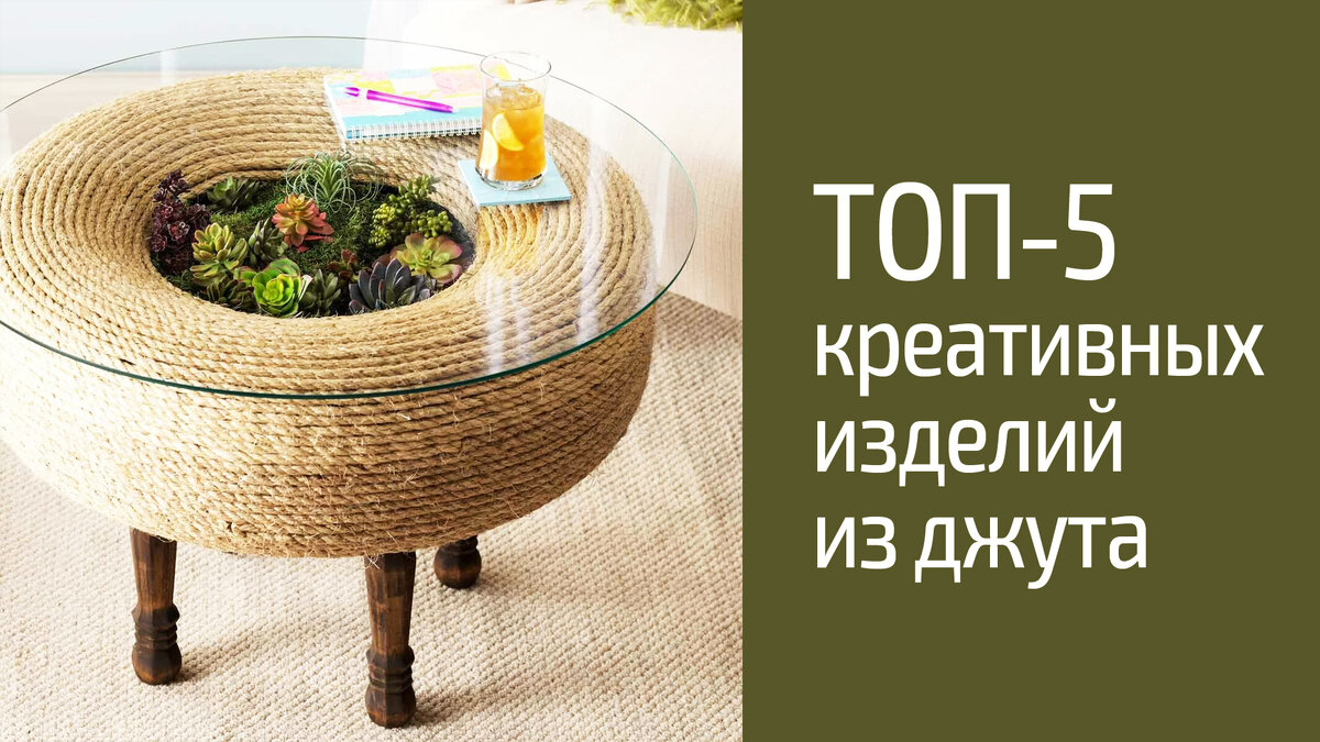 Джут стал моим любимым материалом в последние годы. Наше знакомство привело к постоянному поиску новых идей: хочется пробовать, экспериментировать и как-то разнообразить быт. Поделюсь с вами некоторыми интернет-находками, которые удивили меня, а некоторые очень хочется повторить. Джутовый столик Не знаю.. меня эта идея вдохновляет. Хочется реализовать нечто подобное. За основу использована обычная автомобильная покрышка. К основанию прикручена деревянная заглушка. Далее форма проклеивается по кругу джутовой веревкой 8-10 мм в диаметре (используется термоклей). Для столика нужно будет прикупить 3 деревянные ножки и прикрутить на данном этапе. Внутри важно атмосферно расположить суккуленты, а может быть стабилизированный мох. Также необходимо подобрать стекло несколько больше по диметру, чем полученное основание. Круто! Очень необычный и уютный интерьерный столик будет притягивать взгляды. Кошелек из джута Здесь уже не обойтись без навыков вязания крючком. Для изготовления использован д