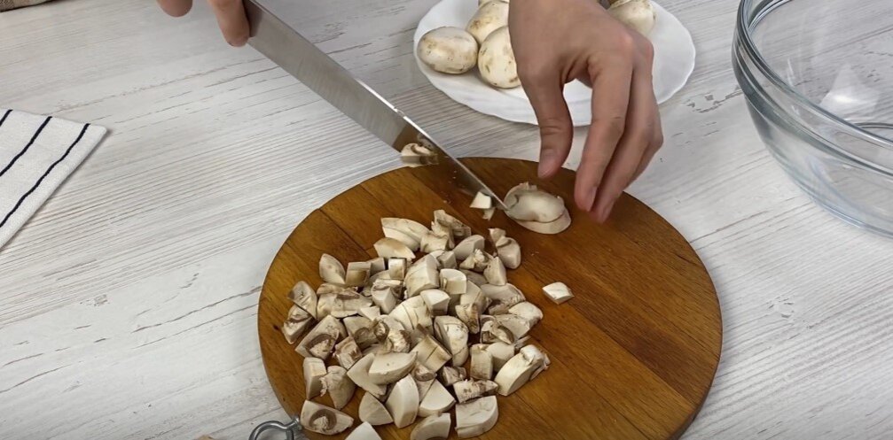 Гости съели его за 5 минут! Все потому, что салат очень вкусный и необычный. Курочка идеально сочетается с шампиньонами, салат кроме того,что вкусный, получается сытным. Забирайте рецепт к себе в копилочку. Для начала нарезаем лук и шампиньоны небольшими кубиками. Мы их будем обжаривать, поэтому грибы режем чуть крупнее, так как они уменьшатся в объеме. На разогретом масле обжариваем лук до прозрачного состояния и добавляем грибы. Как только жидкость из них испарится, и грибы приобретут золотистый цвет, снимаем с огня и даем полностью остыть. Куриное филе или окорочка заранее отвариваем в подсоленной воде и остужаем в бульоне,в котором они варились,для того,чтобы мясо оставалось мягким и нежным. Я обычно использую окорочка, отвариваю,а затем отделяю мякоть от кости. Далее нарезаем курицу произвольно: кубиками, полосками или просто можно порвать руками. Отправляем в глубокую миску. Режем маринованные огурцы небольшой соломкой и добавляем к курице. К этому моменту уже должны остыть