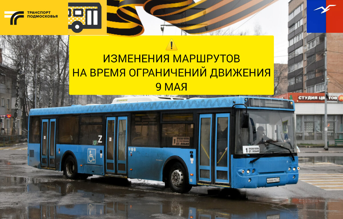 Уважаемые жители и гости города Лобня! В связи с проведением праздничных мероприятий приуроченых к 77 годовщине Победы, изменяются маршруты городского общественного транспорта. С 9:30 до 13:30 автобусы маршрута 9 будут следовать по маршруту : Красная поляна - Улица Текстильная -Улица Ленина- Станция МЦД Лобня со всеми остановками на пути следования. Остановки: Пучки,Тетра-пак, Мемориал,Поворот на Красную поляну,Киовские горки,Улица Чайковского,Депо,Сельхозтехника,Камерная сцена,Букино ( в обе стороны ) обслуживаться не будут. С 11:00 до 13:30 автобусы маршрута 5 будут следовать по маршруту : Станция МЦД Лобня-Улица Ленина-Улица Текстильная-Краснополянское шоссе-Платформа Луговая со всеми остановками на пути следования. Остановки: Улица Чайковского,Депо,Сельхозтехника,Букино,Камерная сцена,Магазин Эском, Улица Заречная ( в обе стороны ) обслуживаться не будут. С 11:00 до 13:30 автобусы маршрута 2 вместо улиц: Заречная, Циолковского, Промышленная,Чехова проследуют по улицам Авиационная и