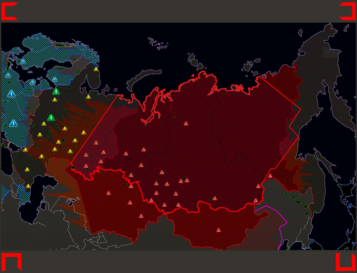 Красная линия отсекала большую часть территории России - за исключением областей Якутии, Чукотки, Приморского края - на востоке. А на западе, линия упиралась в Брянскую область - и далее на север, через радиоактивные плеши и масштабные пустоши - к мертвому Санкт-Петербургу, Петрозаводску и Мурманску.