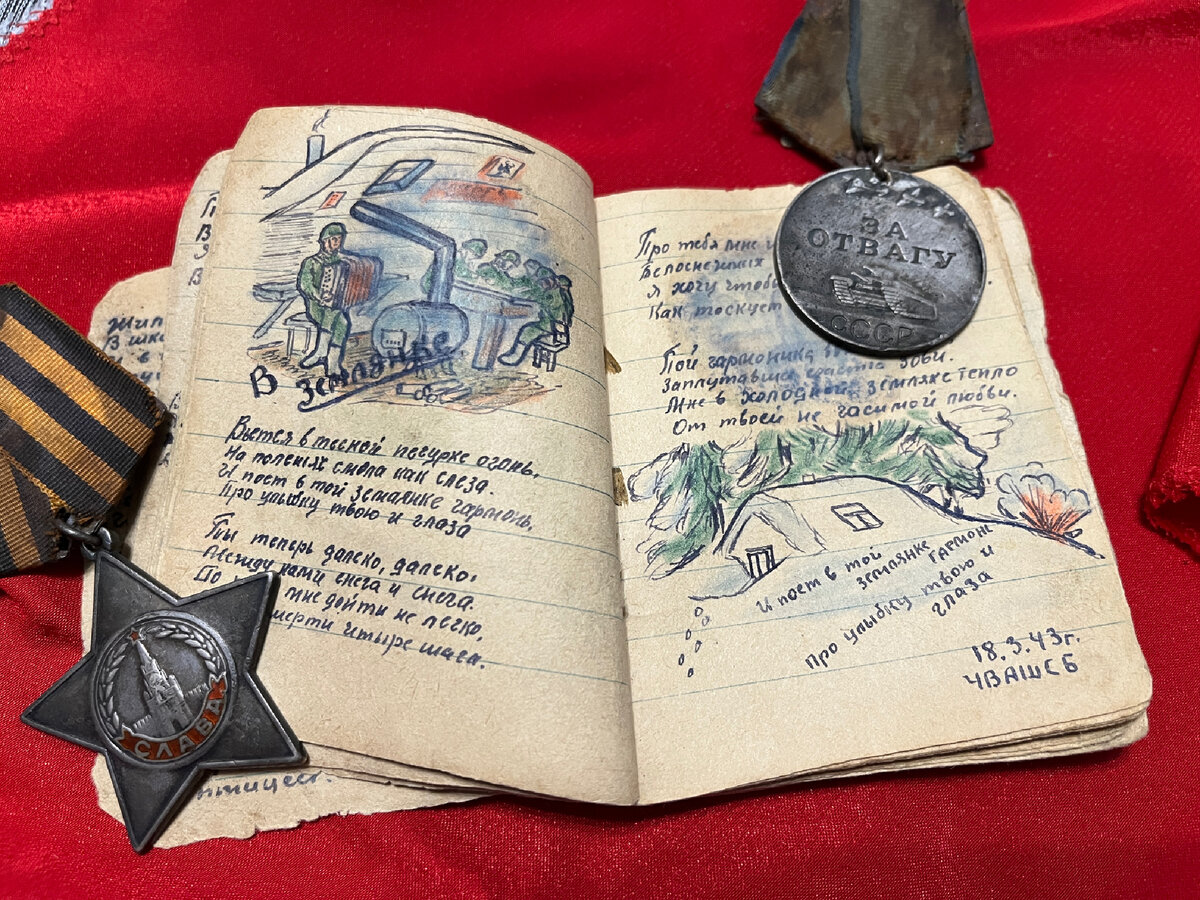 Обветшалые страницы заполнены наполовину - стихами, песнями и рисунками. На многих рисунках подпись и дата - март 1943 года. Все что удалось узнать о владельце - он был курсантом ЧВАШСБ - Челябинской военной авиационной школы стрелков-бомбардиров. Эта школа готовила солдат для фронтовой авиации.