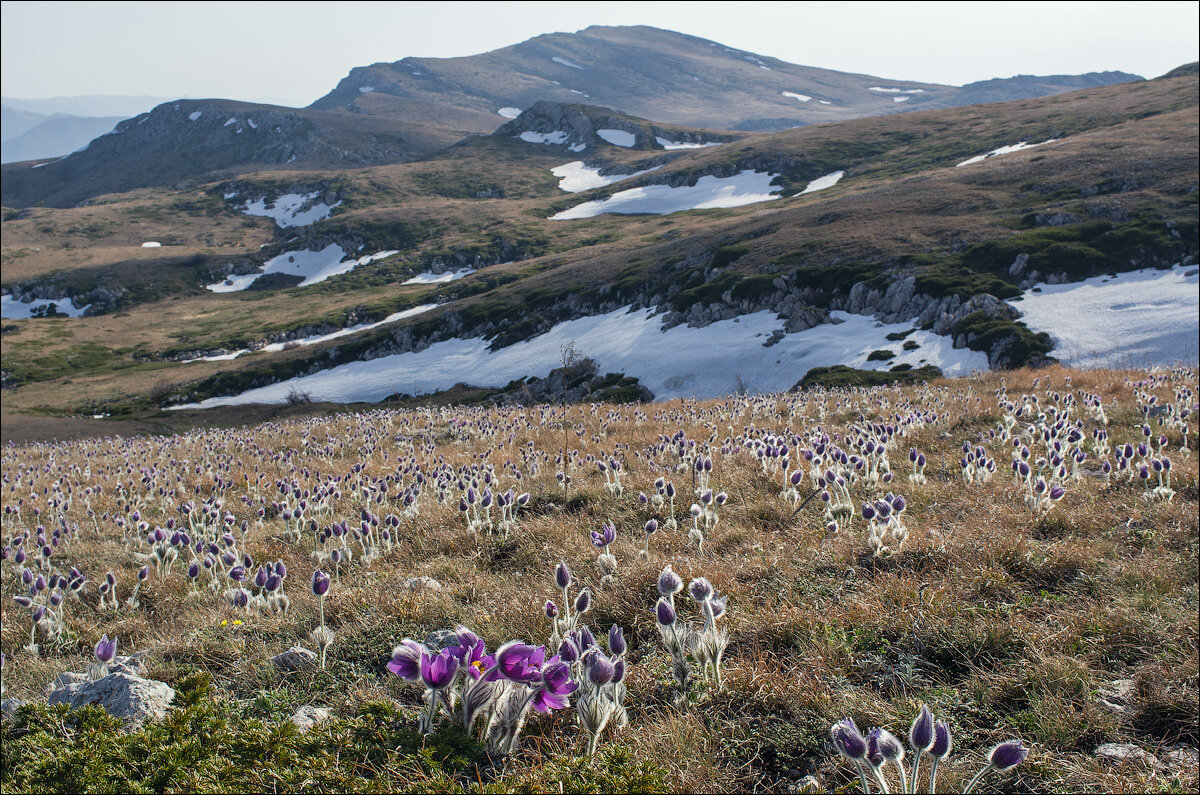 А потом мы выбрались на залитое солнцем нижнее плато Чатыр-Дага. Здесь стелились ароматными подушками бесконечные можжевельники, а между ними сияла пушистыми фиолетовыми головками сон-трава. Бескрайние, невообразимые поляны сон-травы — чудесной, яркой, глядящей жёлтыми внимательными глазками. Лепестки просвечивали на солнце волшебными фонариками, и серебрился густой пух, спасающий цветы от холода горных ветров. Невозможно удержаться и не погладить это пушистое чудо — мягкое, нежное, словно пух крохотного котёнка. А «котята», выстраиваясь бесконечными толпами, весело глядели на нас из травы, тормозя наш и без того не быстрый подъём на Ангар-Бурун.