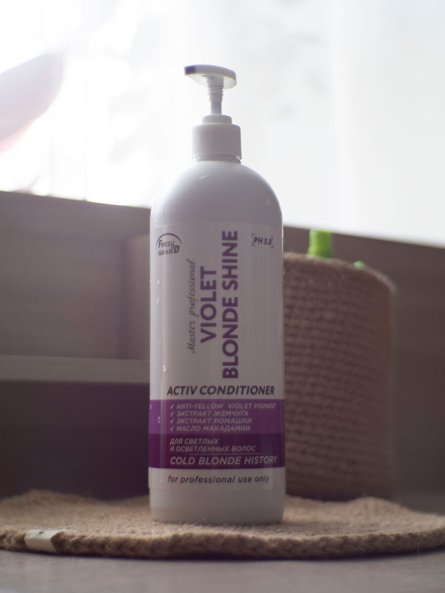 Сегодня я хочу познакомить Вас со своим новым фаворитом для тонирования осветленных волос - кондиционером VIOLET BLONDE SHINE от фирмы FREZY GRAN`D. Моё знакомство с этой фирмой состоялось совсем недавно, первыми покупками стали шампунь и кондиционер для окрашенных волос. Данными продуктами я осталась более чем довольна. Обзор на них Вы можете найти по ссылке: Итак, кондиционер для светлых и осветленных волос фирмы FREZY GRAN`D. Разработано лабораторией: Les QuarissoneL (Франция-Австрия) Изготовитель: ООО "СТИЛЬ-ПРОФИ", Россия, Московская область, г. Павловский Посад Я покупала данный продукт на WildBerries. На момент покупки стоимость составляла 364 руб. Объем - 1000 мл. Активные компоненты: Описание от производителя: Профессиональная формула VIOLET BLONDE SHINE, обогащенная экстрактом жемчуга и тонирующим пигментом, нейтрализует медные оттенки и нежелательную желтизну и придает желаемый холодный оттенок, одновременно оживляя цвет и интенсивно питая волосы. Кондиционер с фиолетовым