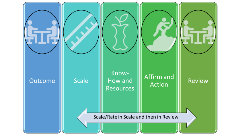 Последним этапом коучинговой модели OSKAR является этап обзора, и этот этап фактически происходит на последующем сеансе. Цель этого этапа — помочь клиенту осмыслить свой прогресс, а также заставить его нести ответственность за прогресс в своих действиях.