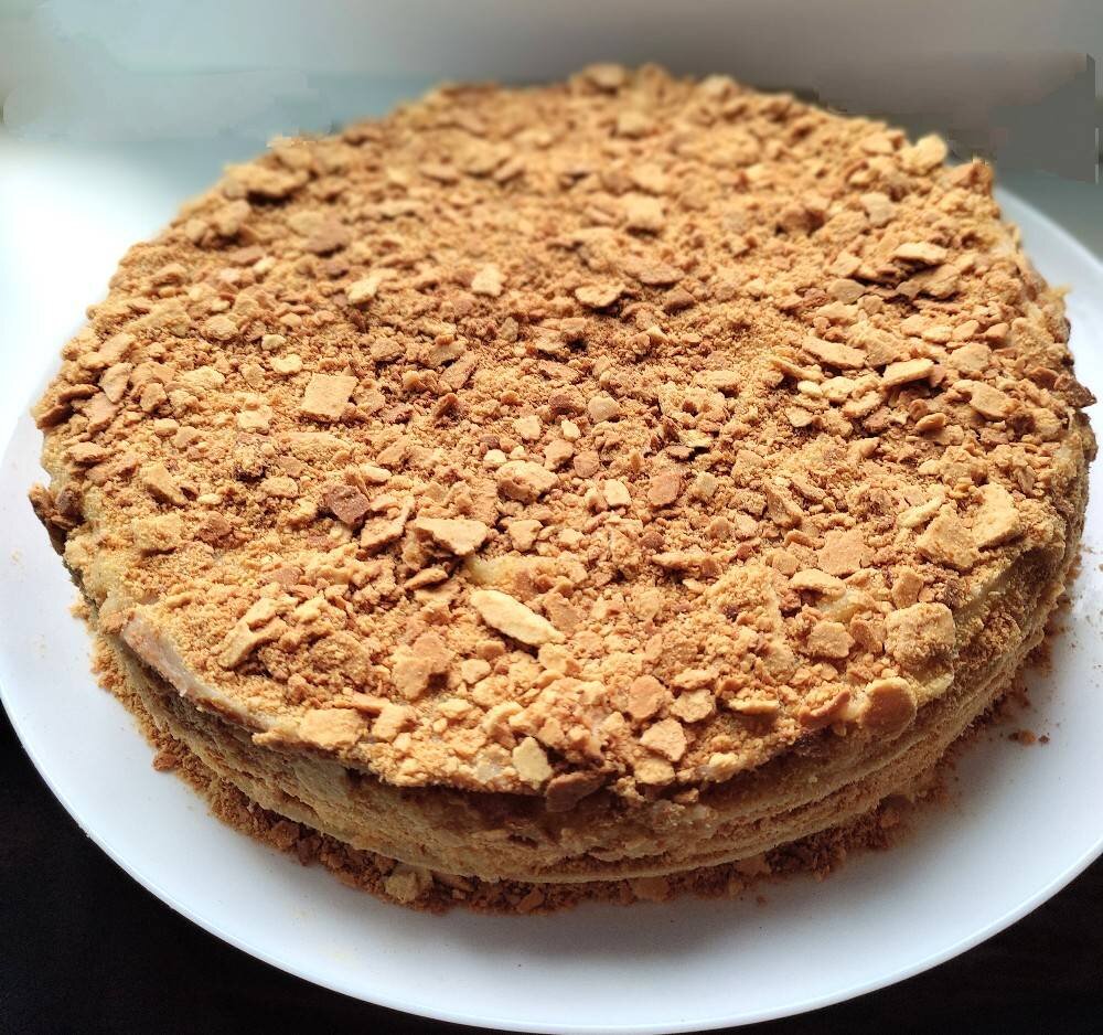 #люблюділитись Ингредиенты: Тісто, Борошно , Цукор , Сода , Сіль , Яйця , Сметана , Вершкове масло , Ванільний цукор, Крем, Молоко , Цукор , Яйця , Борошно , Ванільний цукор Способ приготовления: Тісто. Цукор, сіль, соду, ванільний цукор та яйце змішуємо. Розтопити вершкове масло. Трішки остудити та додати до маси. Додати сметану. Все дуже добре перемішати. По трішки додавати борошно. Замісити тісто. Тісто розділити на 8 рівних частин. Тоненько розкачати, та наколоти виделкою. Форму посипати борошном, переложити тісто на форму. Випікати в заздалегідь розігрітій духовці при температурі 180 градусів, приблизно 5 хвилин. Спечений корж обрізати по трафарету (в мене тарілка). Так само печемо всі коржі. Крем. Цукор, ванільний цукор та яйце гарненько розтерти. Додати борошно і ретельно перемішати. Невеликими порціями додавати молоко і ретельно вимішати щоб не було комочків. Варити на маленькому вогні 10-15 хвилин доки крем не загусне. В кінці додати 20 грам вершкового масла. Кожен корж змащує